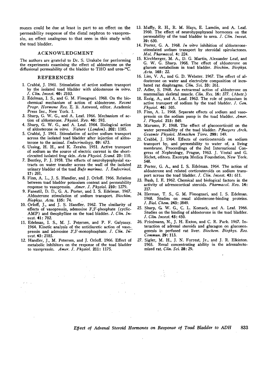 This study was designed to examine the effect of adrenal steroid hormones on the response of the toad bladder to vasopressin. Aldosterone enhanced the short-circuit current response, the osmotic water flow response, and the urea permeability response to vasopressin. Since aldosterone also enhanced the short-circuit current response and the osmotic water flow response to adenosine 3′,5′-monophosphate, the steroid effect on the bladder's response to vasopressin appears to be at a step beyond the stimulation of adenyl cyclase.