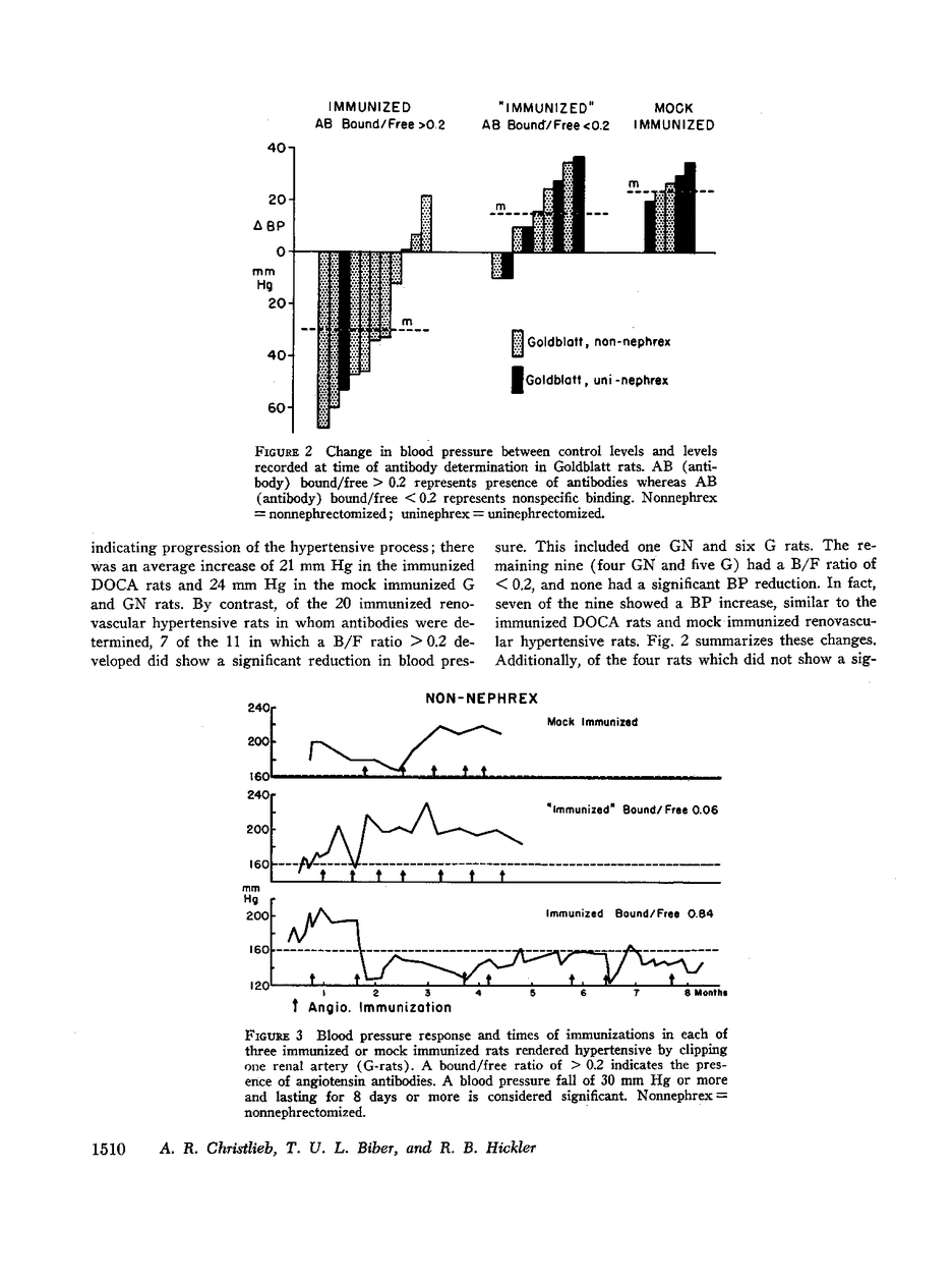 The role of angiotensin in three forms of experimental hypertension was assessed in rats. First, the acute blood pressure response to injected angiotensin amide and angiotensin acid was determined. Rats made hypertensive with deoxycorticosterone and saline showed exaggerated responses; rats made hypertensive by clipping one renal artery showed depressed responses; and rats made hypertensive by clipping one renal artery and contralateral nephrectomy showed normal responsivity to angiotensin amide but depressed responsivity to angiotensin acid. These findings suggested that different mechanisms may be involved in the three types of hypertension studied.