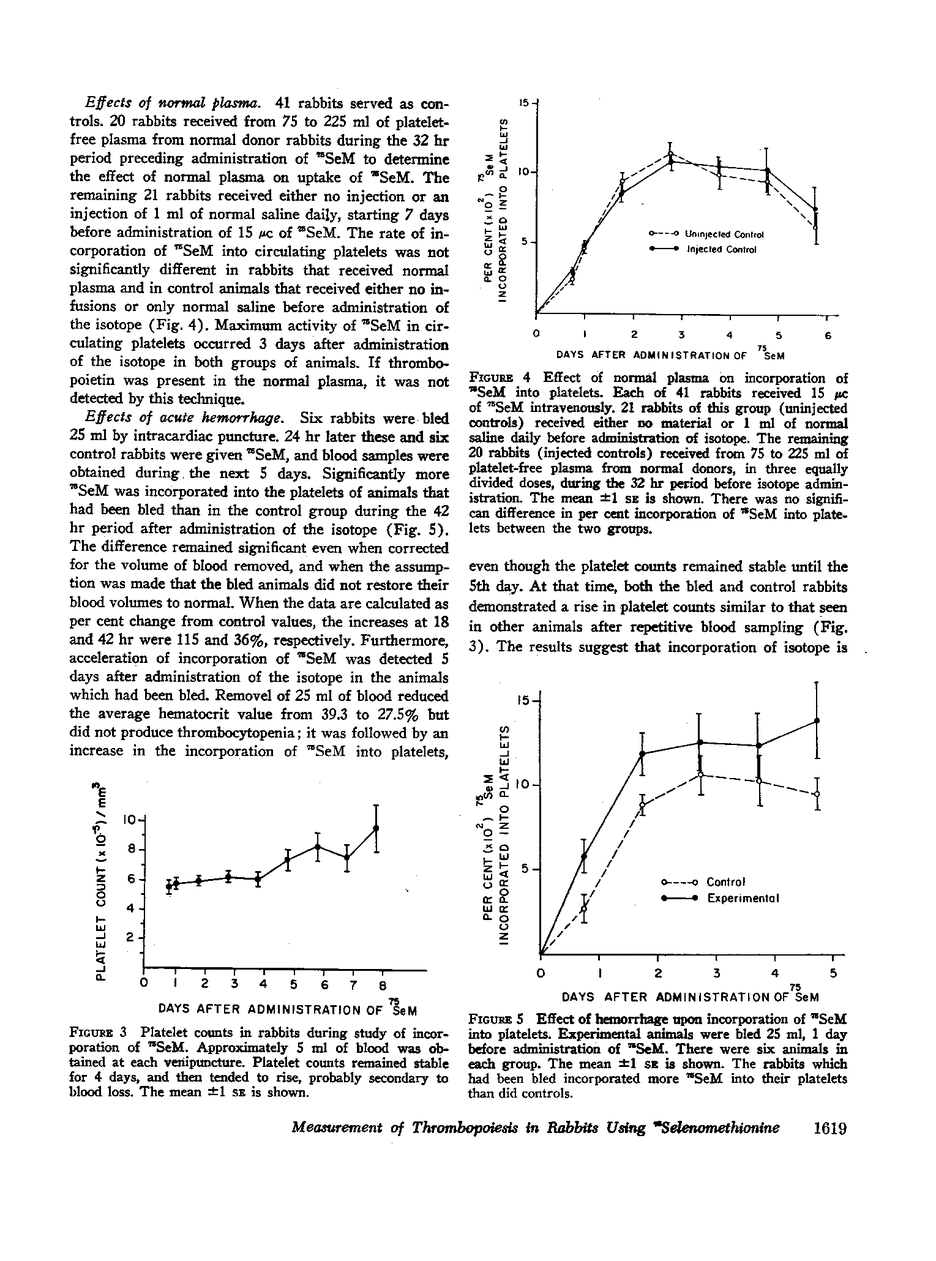 Incorporation of 75selenomethionine (75SeM) has been used to study platelet production in rabbits. Radioactivity of platelets was low after the intravenous administration of 75SeM and rose to a maximum approximately 3 days after administration. Platelet radioactivity was independent of concurrent plasma levels. The life span of rabbit platelets, as estimated with this technique, was 4-5 days. In vivo reutilization of 75SeM previously incorporated into plasma proteins was not detected. In vitro incorporation of 75SeM by platelets in platelet-rich plasma was not demonstrated.
