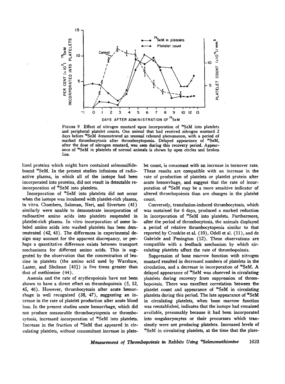 Incorporation of 75selenomethionine (75SeM) has been used to study platelet production in rabbits. Radioactivity of platelets was low after the intravenous administration of 75SeM and rose to a maximum approximately 3 days after administration. Platelet radioactivity was independent of concurrent plasma levels. The life span of rabbit platelets, as estimated with this technique, was 4-5 days. In vivo reutilization of 75SeM previously incorporated into plasma proteins was not detected. In vitro incorporation of 75SeM by platelets in platelet-rich plasma was not demonstrated.