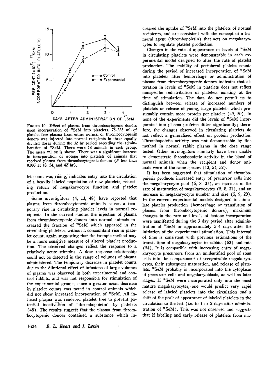 Incorporation of 75selenomethionine (75SeM) has been used to study platelet production in rabbits. Radioactivity of platelets was low after the intravenous administration of 75SeM and rose to a maximum approximately 3 days after administration. Platelet radioactivity was independent of concurrent plasma levels. The life span of rabbit platelets, as estimated with this technique, was 4-5 days. In vivo reutilization of 75SeM previously incorporated into plasma proteins was not detected. In vitro incorporation of 75SeM by platelets in platelet-rich plasma was not demonstrated.