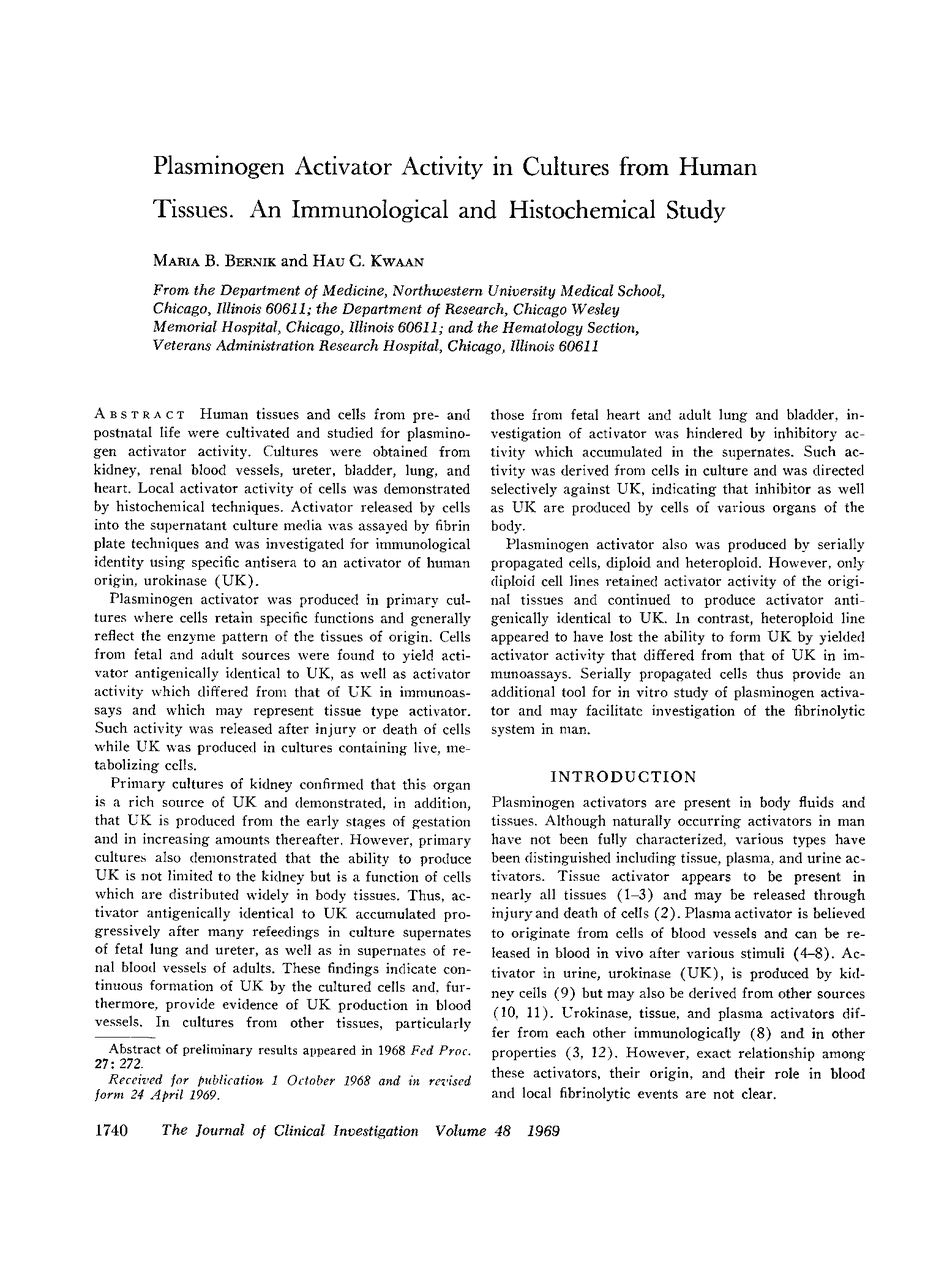Human tissues and cells from pre- and postnatal life were cultivated and studied for plasminogen activator activity. Cultures were obtained from kidney, renal blood vessels, ureter, bladder, lung, and heart. Local activator activity of cells was demonstrated by histochemical techniques. Activator released by cells into the supernatant culture media was assayed by fibrin plate techniques and was investigated for immunological identity using specific antisera to an activator of human origin, urokinase (UK).