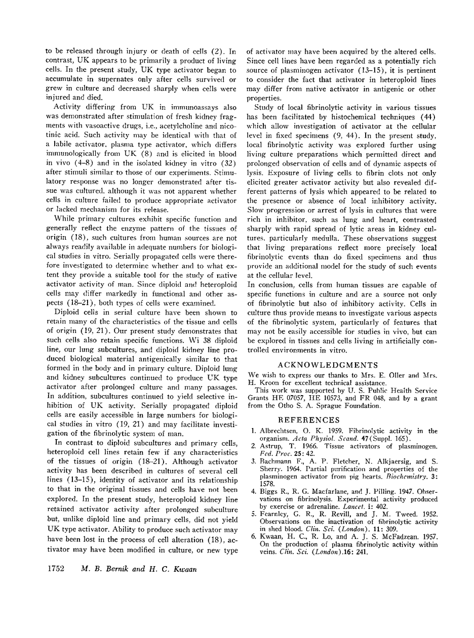 Human tissues and cells from pre- and postnatal life were cultivated and studied for plasminogen activator activity. Cultures were obtained from kidney, renal blood vessels, ureter, bladder, lung, and heart. Local activator activity of cells was demonstrated by histochemical techniques. Activator released by cells into the supernatant culture media was assayed by fibrin plate techniques and was investigated for immunological identity using specific antisera to an activator of human origin, urokinase (UK).