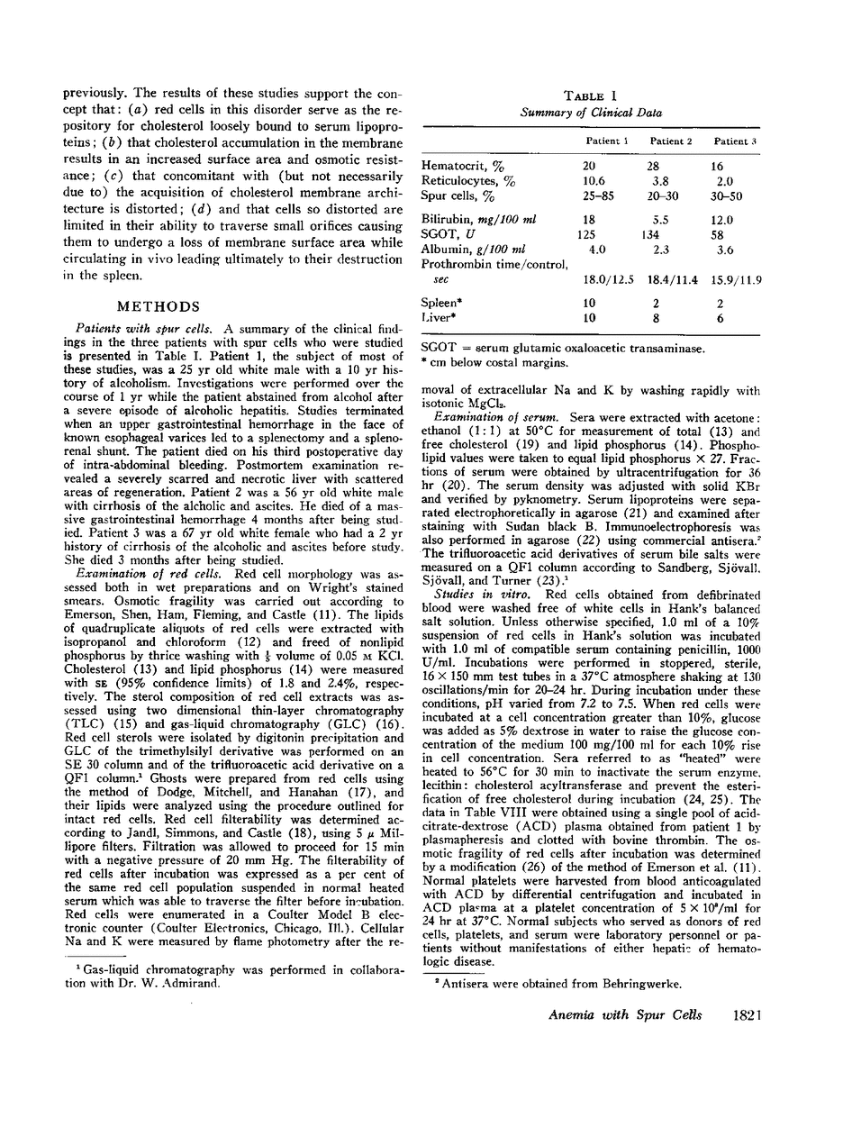 The sera and red cells of three patients with severe liver disease and “spur cells” were studied. In each case the per cent of serum cholesterol which was free (unesterified) was elevated, and the serum lecithin: cholesterol acyltransferase activity was depressed. Lipoproteins with beta mobility were increased, but exhibited immune reactivity with antisera to both alpha- and beta-lipoproteins. Serum bile salt concentrations were markedly elevated and consisted primarily of chenodeoxycholic acid, with small amounts of lithocholic acid present as well.