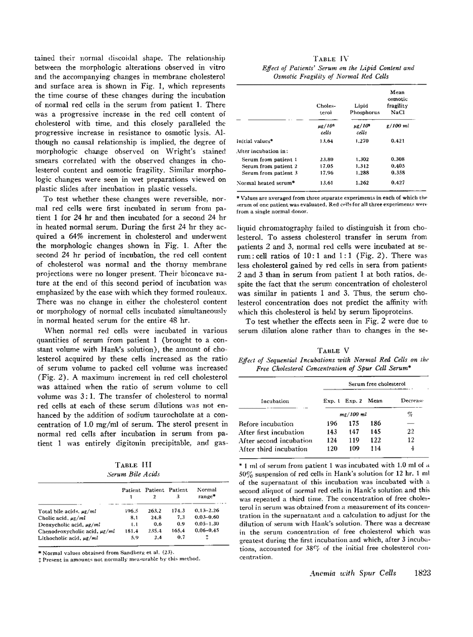 The sera and red cells of three patients with severe liver disease and “spur cells” were studied. In each case the per cent of serum cholesterol which was free (unesterified) was elevated, and the serum lecithin: cholesterol acyltransferase activity was depressed. Lipoproteins with beta mobility were increased, but exhibited immune reactivity with antisera to both alpha- and beta-lipoproteins. Serum bile salt concentrations were markedly elevated and consisted primarily of chenodeoxycholic acid, with small amounts of lithocholic acid present as well.