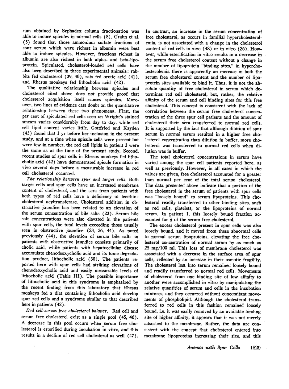 The sera and red cells of three patients with severe liver disease and “spur cells” were studied. In each case the per cent of serum cholesterol which was free (unesterified) was elevated, and the serum lecithin: cholesterol acyltransferase activity was depressed. Lipoproteins with beta mobility were increased, but exhibited immune reactivity with antisera to both alpha- and beta-lipoproteins. Serum bile salt concentrations were markedly elevated and consisted primarily of chenodeoxycholic acid, with small amounts of lithocholic acid present as well.