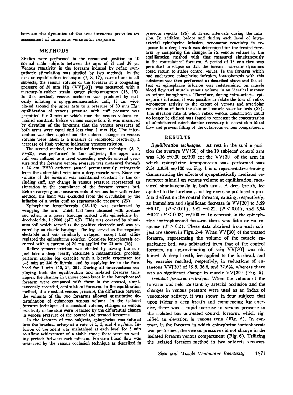 To determine the relative participation of skin and muscle capacitance beds of the forearm in venomotor reflexes, epinephrine iontophoresis was combined with forearm plethysmography so that the volume of muscle veins could be estimated simultaneously with the volume of cutaneous veins, at a constant venous pressure. With this technique not only are the cutaneous veins markedly constricted but they also are prevented from filling since skin blood flow is abolished. In 10 normal subjects, the venous volume in the elevated control forearm at a congesting pressure of 30 mm Hg (VV[30]) was 3.16 ±0.30 SEM cc/100 cc, while in the iontophoresed arm it was 2.54 ±0.31 cc/100 cc. Thus the forearm cutaneous VV[30] was 1.62 cc/100 cc. With a deep breath, ice to the forehead, and leg exercise, and cutaneous VV[30] decreased 19.8% (P < 0.01), 36.6% (P < 0.01), and 32.6% (P < 0.02), respectively, whereas the muscle VV[30] was not altered significantly. Similar results were observed using the isolated forearm technique and a deep muscle vein. The infusion of epinephrine intra-arterially did not decrease reflex venomotor reactivity until cutaneous blood flow was completely suppressed, indicating that the inability of the veins to react in the iontophoresed arm was not the result of epinephrine diffusion into the muscle bed. Thus, these results indicate that, in the forearm, only cutaneous veins participate in venomotor reflexes. Further, since the forearm is principally composed of skeletal muscle and the hand skin, an explanation is provided for the observation that veins of the forearm, studied as a whole, appear less reactive to stimuli than veins of the hand. An explanation also is provided for fainting which occurs during motionless standing despite intense venoconstriction, thereby emphasizing the importance of the skeletal muscle pump in the legs in preventing postural syncope.