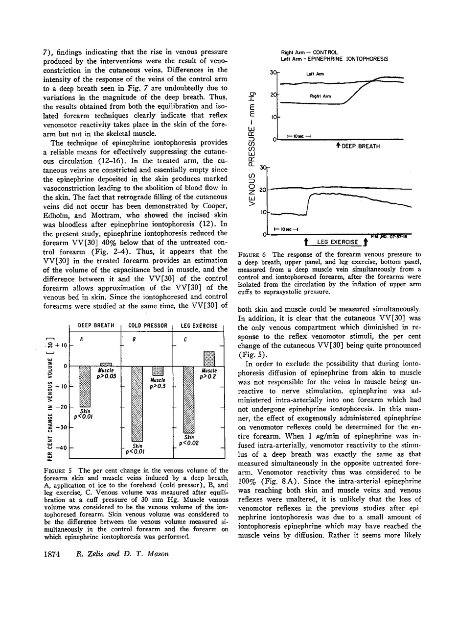 To determine the relative participation of skin and muscle capacitance beds of the forearm in venomotor reflexes, epinephrine iontophoresis was combined with forearm plethysmography so that the volume of muscle veins could be estimated simultaneously with the volume of cutaneous veins, at a constant venous pressure. With this technique not only are the cutaneous veins markedly constricted but they also are prevented from filling since skin blood flow is abolished. In 10 normal subjects, the venous volume in the elevated control forearm at a congesting pressure of 30 mm Hg (VV[30]) was 3.16 ±0.30 SEM cc/100 cc, while in the iontophoresed arm it was 2.54 ±0.31 cc/100 cc. Thus the forearm cutaneous VV[30] was 1.62 cc/100 cc. With a deep breath, ice to the forehead, and leg exercise, and cutaneous VV[30] decreased 19.8% (P < 0.01), 36.6% (P < 0.01), and 32.6% (P < 0.02), respectively, whereas the muscle VV[30] was not altered significantly. Similar results were observed using the isolated forearm technique and a deep muscle vein. The infusion of epinephrine intra-arterially did not decrease reflex venomotor reactivity until cutaneous blood flow was completely suppressed, indicating that the inability of the veins to react in the iontophoresed arm was not the result of epinephrine diffusion into the muscle bed. Thus, these results indicate that, in the forearm, only cutaneous veins participate in venomotor reflexes. Further, since the forearm is principally composed of skeletal muscle and the hand skin, an explanation is provided for the observation that veins of the forearm, studied as a whole, appear less reactive to stimuli than veins of the hand. An explanation also is provided for fainting which occurs during motionless standing despite intense venoconstriction, thereby emphasizing the importance of the skeletal muscle pump in the legs in preventing postural syncope.