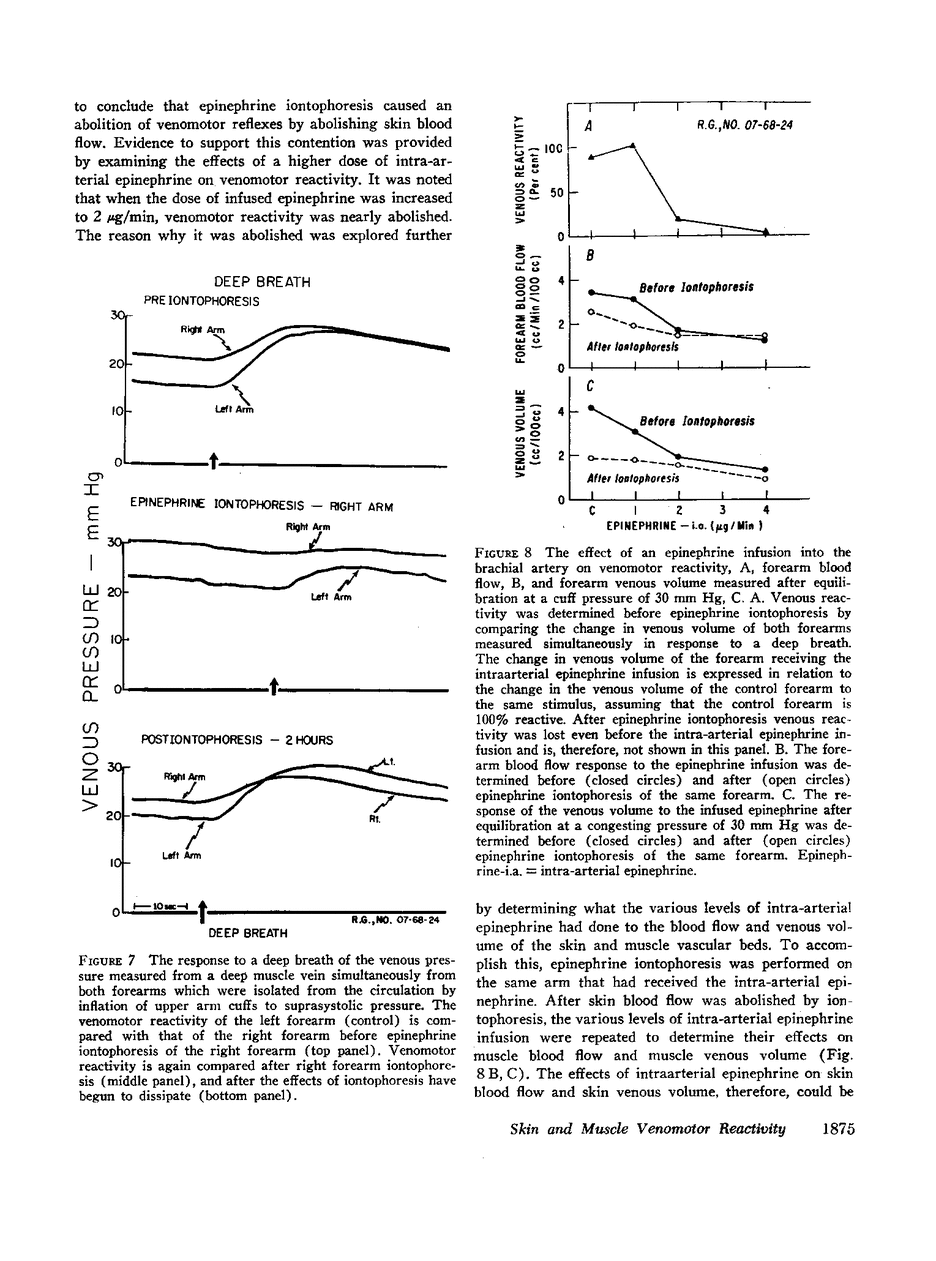 To determine the relative participation of skin and muscle capacitance beds of the forearm in venomotor reflexes, epinephrine iontophoresis was combined with forearm plethysmography so that the volume of muscle veins could be estimated simultaneously with the volume of cutaneous veins, at a constant venous pressure. With this technique not only are the cutaneous veins markedly constricted but they also are prevented from filling since skin blood flow is abolished. In 10 normal subjects, the venous volume in the elevated control forearm at a congesting pressure of 30 mm Hg (VV[30]) was 3.16 ±0.30 SEM cc/100 cc, while in the iontophoresed arm it was 2.54 ±0.31 cc/100 cc. Thus the forearm cutaneous VV[30] was 1.62 cc/100 cc. With a deep breath, ice to the forehead, and leg exercise, and cutaneous VV[30] decreased 19.8% (P < 0.01), 36.6% (P < 0.01), and 32.6% (P < 0.02), respectively, whereas the muscle VV[30] was not altered significantly. Similar results were observed using the isolated forearm technique and a deep muscle vein. The infusion of epinephrine intra-arterially did not decrease reflex venomotor reactivity until cutaneous blood flow was completely suppressed, indicating that the inability of the veins to react in the iontophoresed arm was not the result of epinephrine diffusion into the muscle bed. Thus, these results indicate that, in the forearm, only cutaneous veins participate in venomotor reflexes. Further, since the forearm is principally composed of skeletal muscle and the hand skin, an explanation is provided for the observation that veins of the forearm, studied as a whole, appear less reactive to stimuli than veins of the hand. An explanation also is provided for fainting which occurs during motionless standing despite intense venoconstriction, thereby emphasizing the importance of the skeletal muscle pump in the legs in preventing postural syncope.