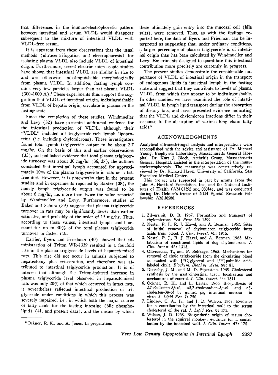 The transport of endogenous lipids in the lipoproteins of mesenteric lymph was studied in fasting rats with mesenteric lymph fistulas. The lymph was found to contain, in addition to chylomicrons (Sf >400), a significant amount of another, more dense, triglyceride-rich fraction, the very low density lipoproteins (VLDL), which showed a peak Sf of 102. The VLDL differed from chylomicrons not only in flotation, but also in per cent lipid composition and electrophoretic mobility in agarose gel. The VLDL fraction was found to contain 47% of the triglyceride and 54% of the cholesterol of fasting lymph and, in the fasting state, was the major lipoprotein species present.