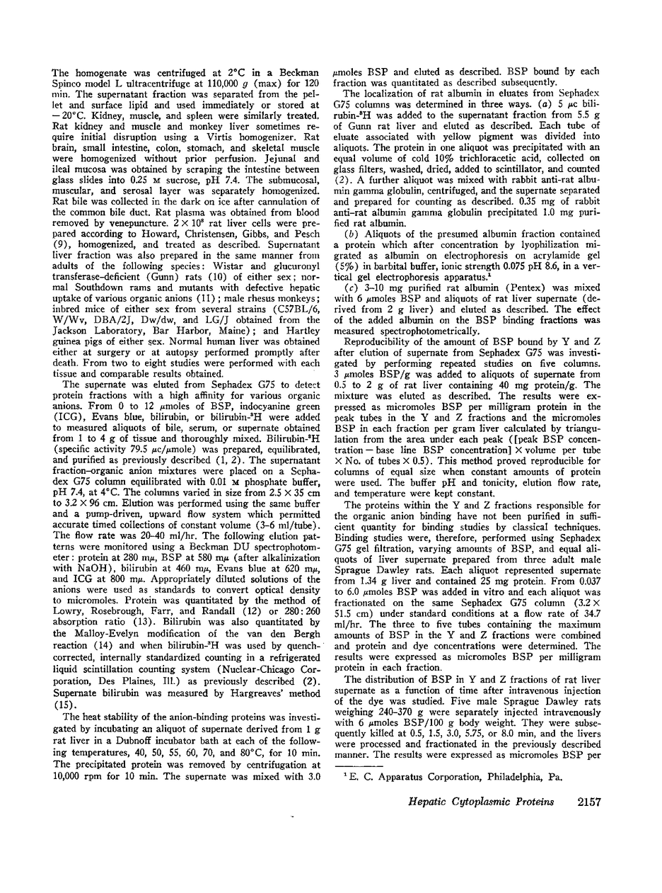 Two hepatic cytoplasmic protein fractions, designated Y and Z, which bind sulfobromophthalein (BSP), bilirubin, and other organic anions, have been separated by G75 Sephadex gel filtration. The physiologic role of these protein fractions has been investigated. They are present in the 110,000 g supernatant fraction from the livers of all the species tested (rats, mice, guinea pigs, Rhesus monkeys, sheep, and man). Tissues which do not preferentially extract BSP or bilirubin from plasma do not contain these fractions, with the exception of small intestinal mucosa which contains Z. Anion binding by Y and Z fractions is not due to contamination with albumin. These fractions are responsible for the cytoplasmic localization of bilirubin in Gunn rats, and the fractions bind bilirubin, BSP, or indocyanine green (ICG), whether given in vivo or added in vitro to liver supernate from normal rats. Flavaspidic acid-N-methylglucaminate, bunamiodyl, and iodipamide, drugs known to interfere with the hepatic uptake mechanism, compete with bilirubin and BSP for binding to Z. These proteins appear to be important in the transfer of organic anions from plasma into the liver and provide a tool for the investigation of hepatic uptake mechanisms.