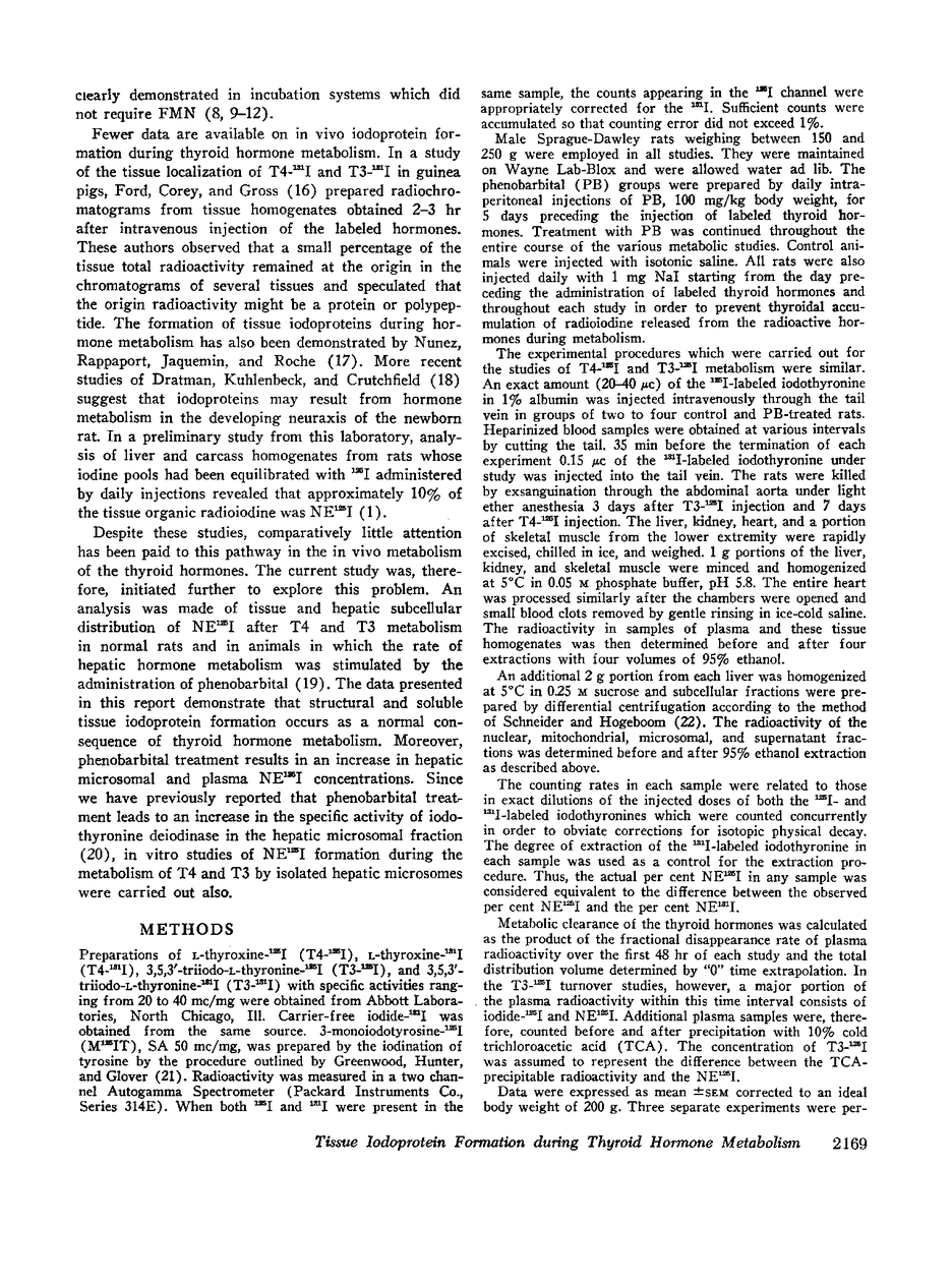 The formation of tissue iodoproteins during the peripheral metabolism of the thyroid hormones was examined by determining the concentration of nonethanol-extractable 125I (NE125I) in various tissues after the intravenous injection of 3,5,3′-triiodo-L-thyronine (T3-125I) and L-thyroxine-125I (T4-125I) in groups of rats with iodide-blocked thyroid glands. 3 days after T3-125I and 7 days after T4-125I injection the concentration of NE125I in the liver and kidney was 5-10 times greater than in plasma. Smaller but nonetheless significant concentrations of NE125I were demonstrated in skeletal and cardiac muscle. Hepatic subcellular fractionation studies revealed that the major portion of the liver NE125I was in the microsomal fraction. Lower concentrations of NE125I were present in the nuclear, mitochondrial, and soluble fractions. When similar studies were performed in groups of rats pretreated with phenobarbital, an increase in the metabolic clearance of T3-125I (30%) and T4-125I (100%) was observed along with a highly significant increase in the NE125I concentration of the liver and plasma. The increase in hepatic NE125I in these studies was primarily due to the microsomal component.