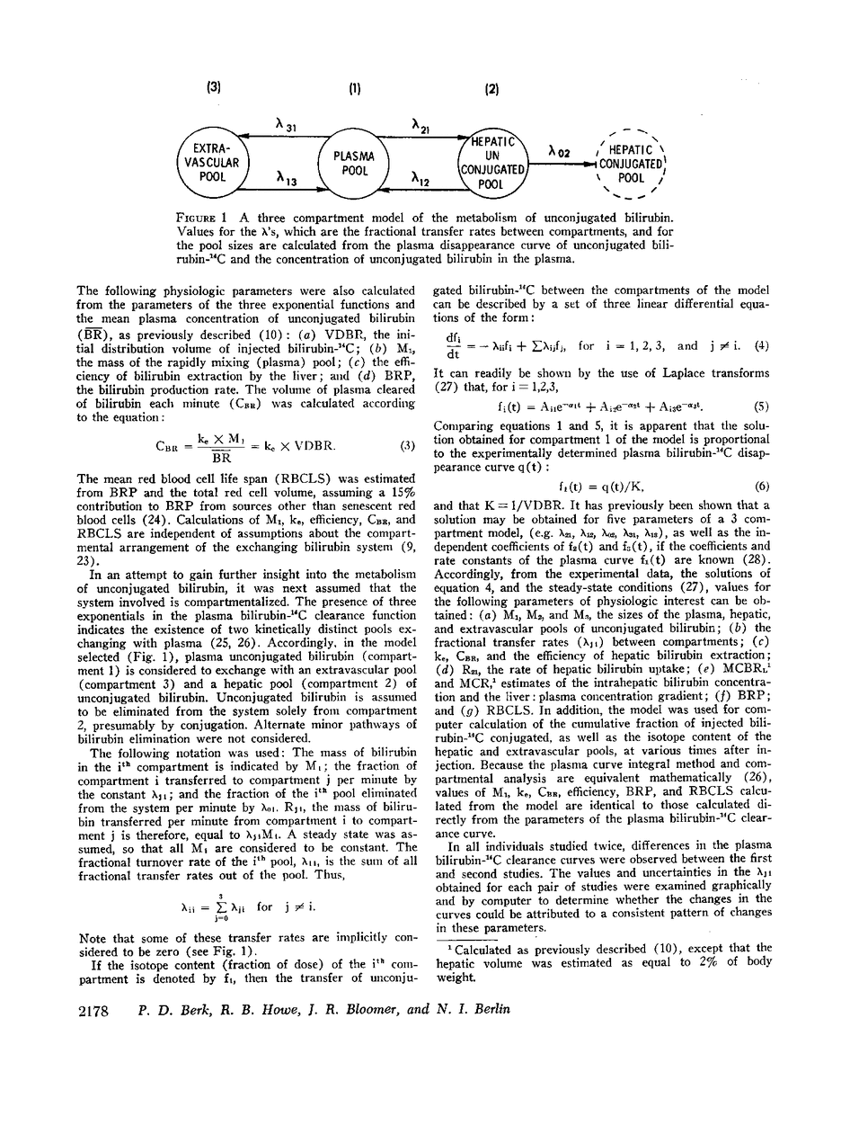 This report describes studies of bilirubin kinetics in 13 healthy young adults. The plasma content of unconjugated bilirubin-14C was determined at frequent intervals for 24-30 hr after the intravenous injection of a tracer dose of unconjugated isotopic bilirubin. Fecal and urinary radioactivity were measured for 7 days. During this time cumulative recovery averaged 96% of the injected dose. The plasma curves were processed by digital computer. For the 30 hr experimental period, a sum of three exponentials, with average half-times of 18, 81, and 578 min, was required to describe the data. Using the plasma curve integral method, the hepatic bilirubin clearance (47 ±10 ml/min, mean ±SD), the bilirubin production rate (3.8 ±0.6 mg/kg per day), and the mean red blood cell life span (101 ±13 days) were calculated directly from the parameters of this function. To gain further insight into the metabolism of unconjugated bilirubin, the data were also used to determine the parameters of a multicompartmental model. In the model proposed, plasma unconjugated bilirubin exchanges with two additional pools one of which is thought to represent extrahepatic extravascular, and the other intrahepatic unconjugated bilirubin. Bilirubin is eliminated from the system via the proposed intrahepatic pool. From the data and the model, pool sizes and exchange rates between compartments were calculated, and the liver: plasma concentration gradient estimated. These studies provide a detailed analysis of the kinetics of unconjugated bilirubin in a healthy normal population and are intended to serve as a reference point for studies of abnormal states.