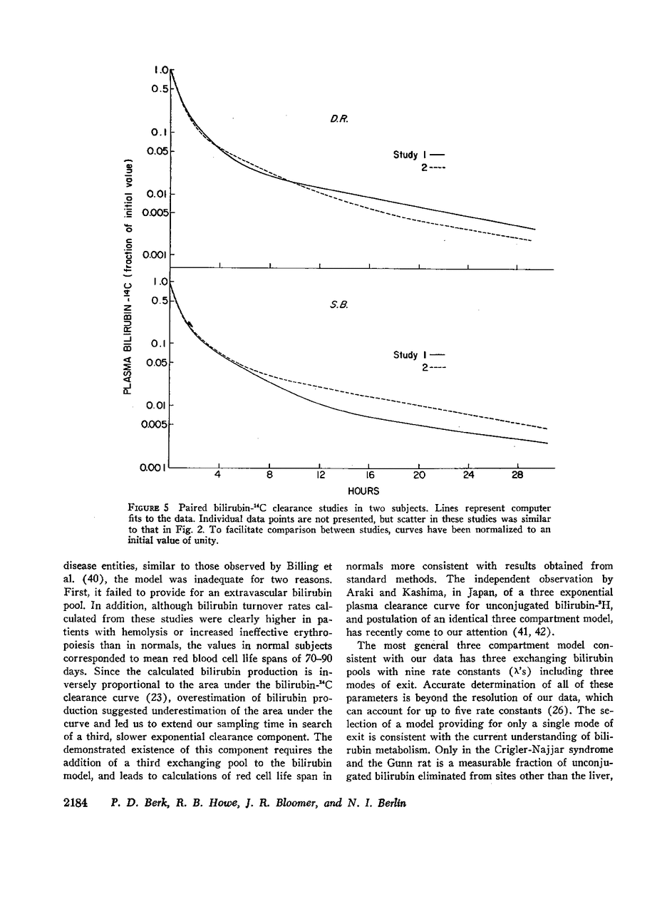 This report describes studies of bilirubin kinetics in 13 healthy young adults. The plasma content of unconjugated bilirubin-14C was determined at frequent intervals for 24-30 hr after the intravenous injection of a tracer dose of unconjugated isotopic bilirubin. Fecal and urinary radioactivity were measured for 7 days. During this time cumulative recovery averaged 96% of the injected dose. The plasma curves were processed by digital computer. For the 30 hr experimental period, a sum of three exponentials, with average half-times of 18, 81, and 578 min, was required to describe the data. Using the plasma curve integral method, the hepatic bilirubin clearance (47 ±10 ml/min, mean ±SD), the bilirubin production rate (3.8 ±0.6 mg/kg per day), and the mean red blood cell life span (101 ±13 days) were calculated directly from the parameters of this function. To gain further insight into the metabolism of unconjugated bilirubin, the data were also used to determine the parameters of a multicompartmental model. In the model proposed, plasma unconjugated bilirubin exchanges with two additional pools one of which is thought to represent extrahepatic extravascular, and the other intrahepatic unconjugated bilirubin. Bilirubin is eliminated from the system via the proposed intrahepatic pool. From the data and the model, pool sizes and exchange rates between compartments were calculated, and the liver: plasma concentration gradient estimated. These studies provide a detailed analysis of the kinetics of unconjugated bilirubin in a healthy normal population and are intended to serve as a reference point for studies of abnormal states.