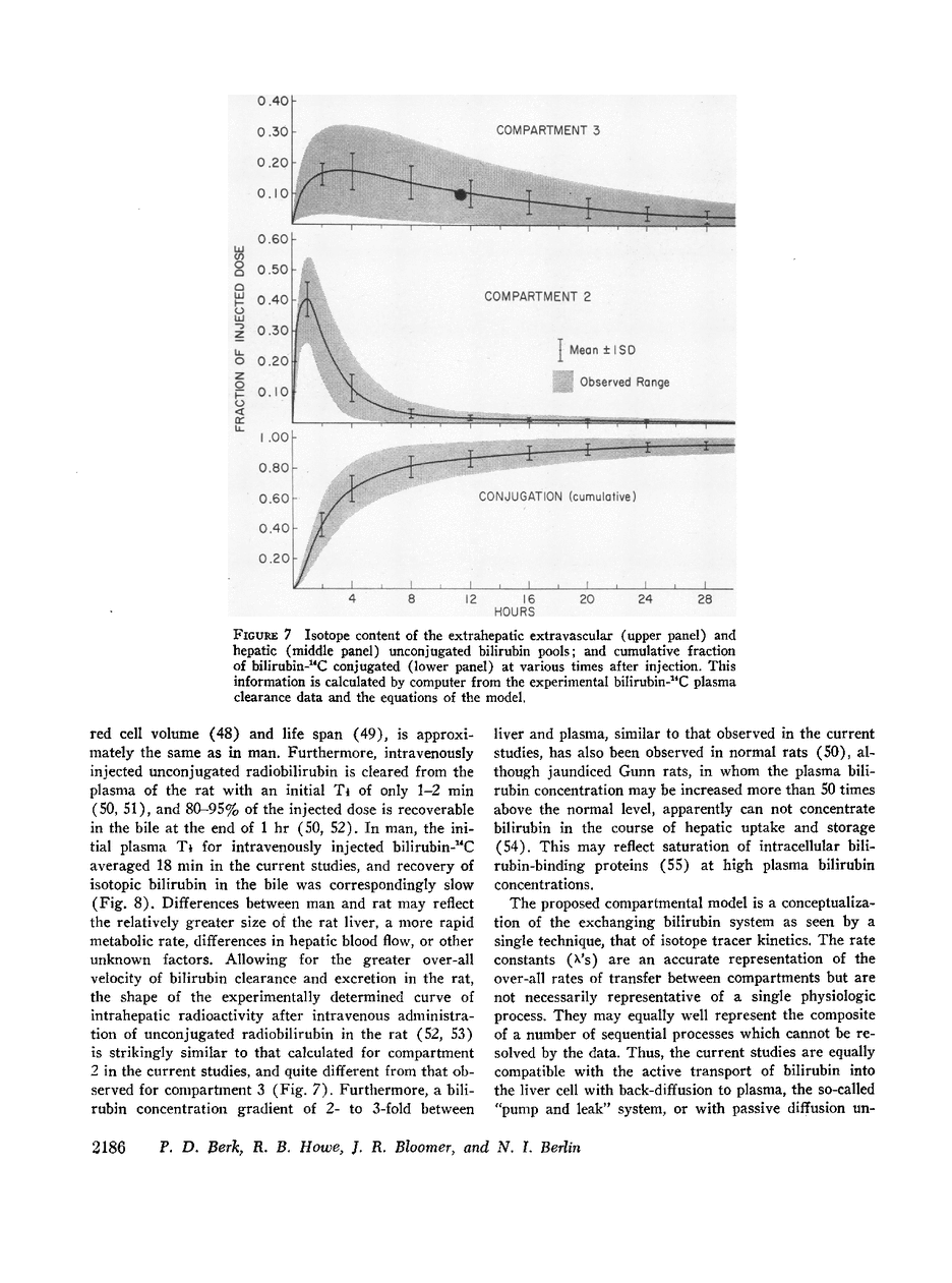 This report describes studies of bilirubin kinetics in 13 healthy young adults. The plasma content of unconjugated bilirubin-14C was determined at frequent intervals for 24-30 hr after the intravenous injection of a tracer dose of unconjugated isotopic bilirubin. Fecal and urinary radioactivity were measured for 7 days. During this time cumulative recovery averaged 96% of the injected dose. The plasma curves were processed by digital computer. For the 30 hr experimental period, a sum of three exponentials, with average half-times of 18, 81, and 578 min, was required to describe the data. Using the plasma curve integral method, the hepatic bilirubin clearance (47 ±10 ml/min, mean ±SD), the bilirubin production rate (3.8 ±0.6 mg/kg per day), and the mean red blood cell life span (101 ±13 days) were calculated directly from the parameters of this function. To gain further insight into the metabolism of unconjugated bilirubin, the data were also used to determine the parameters of a multicompartmental model. In the model proposed, plasma unconjugated bilirubin exchanges with two additional pools one of which is thought to represent extrahepatic extravascular, and the other intrahepatic unconjugated bilirubin. Bilirubin is eliminated from the system via the proposed intrahepatic pool. From the data and the model, pool sizes and exchange rates between compartments were calculated, and the liver: plasma concentration gradient estimated. These studies provide a detailed analysis of the kinetics of unconjugated bilirubin in a healthy normal population and are intended to serve as a reference point for studies of abnormal states.