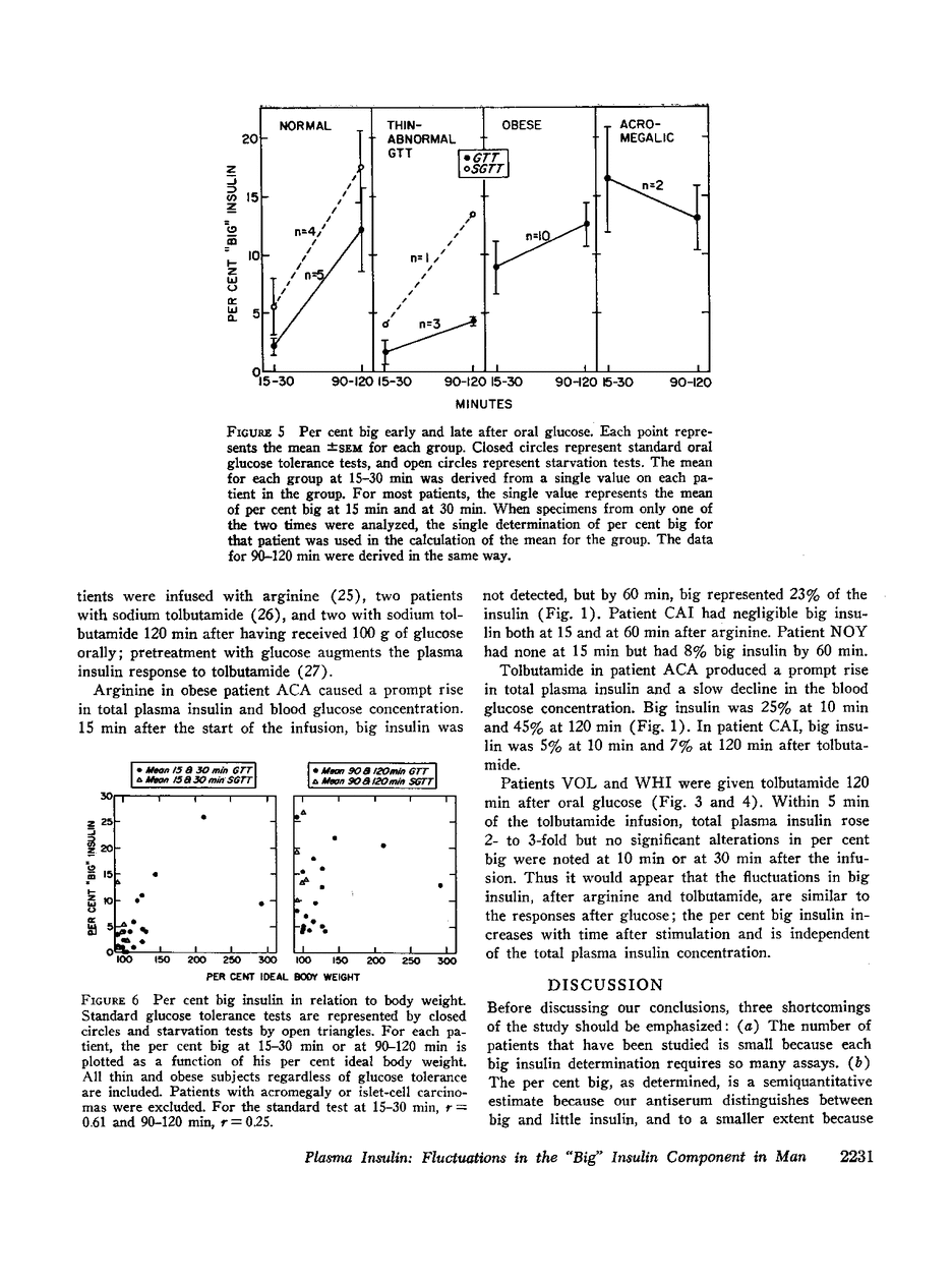 Plasma was filtered on G50 Sephadex, and two components of circulating insulin, “little” insulin and “big” insulin, were measured by immunoassay. The former component is indistinguishable from insulin, whereas the latter more closely resembles proinsulin and the other insulin-like substances isolated from the pancreas. In thin normal subjects, the fraction of plasma insulin that was big insulin (per cent “big”). 15-30 min after oral glucose, was less than 5%; per cent big rose 2- to 8-fold over the next hour and by 90-120 min represented 5-29% of the plasma insulin. In young thin subjects with idiopathic glucose intolerance associated with normal concentrations of plasma insulin, an identical pattern of big insulin was observed. In thin subjects in whom elevations of per cent big at 90-120 min during the standard test were only modest, starvation for 48 hr before the glucose administration resulted in a more pronounced rise in the per cent big insulin. Early after glucose administration to obese and acromegalic subjects, the per cent big was higher than in thin subjects. The magnitude of the elevation was roughly correlated with elevations in the fasting plasma insulin concentration. By 90-120 min, the per cent big in obese and acromegalic patients was the same range as in the thin subjects. Intravenously administered arginine and tolbutamide in a small number of subjects yielded a response that was similar to oral glucose; the per cent big was low early after stimulation and increased with time. In two patients with islet cell carcinomas, the per cent big was in the same range as in normal subjects.