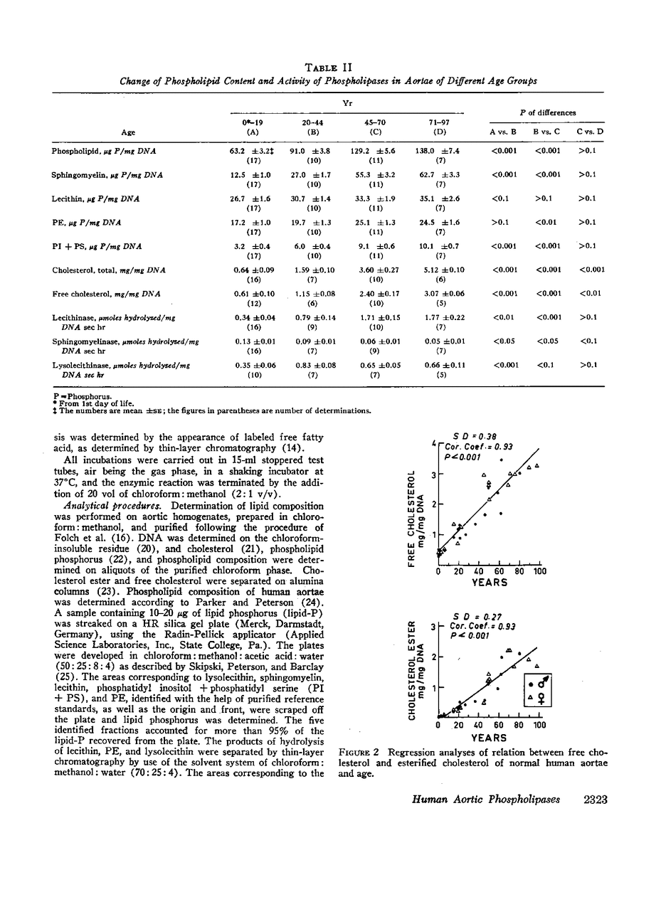 The role of phospholipases in the regulation of the changing phospholipid composition of normal human aortae with age was studied. Portions of grossly and histologically lesion-free ascending aortae from 16 females and 29 males obtained at autopsy, were analyzed for deoxyribonucleic acid (DNA), phospholipid, and cholesterol content and phospholipid composition. Enzymic activity toward four substrates, lecithin (LE), phosphatidyl ethanolamine, lysolecithin, and sphingomyelin (SP), was determined on portions of the same homogenate. By regression analysis for correlation between all determinations and age the following results were obtained: (a) total phospholipids and choleserol increased linearly with age; (b) the increase in sphingomyelin accounted for about 70% of the phospholipid increment; (c) hydrolysis of lecithin and phosphatidyl ethanolamine increased markedly with age, that of lysolecithin only moderately; (d) hydrolysis of sphingomyelin decreased with age; and (e) an inverse relation between the SP/LE ratio and age and sphingomyelinase/lecithinase activity and age was obtained. These results were interpreted to indicate that a causal relation exists between the fall in sphingomyelinase activity, both absolute and relative to lecithinase activity, and the accumulation of sphingomyelin with age.