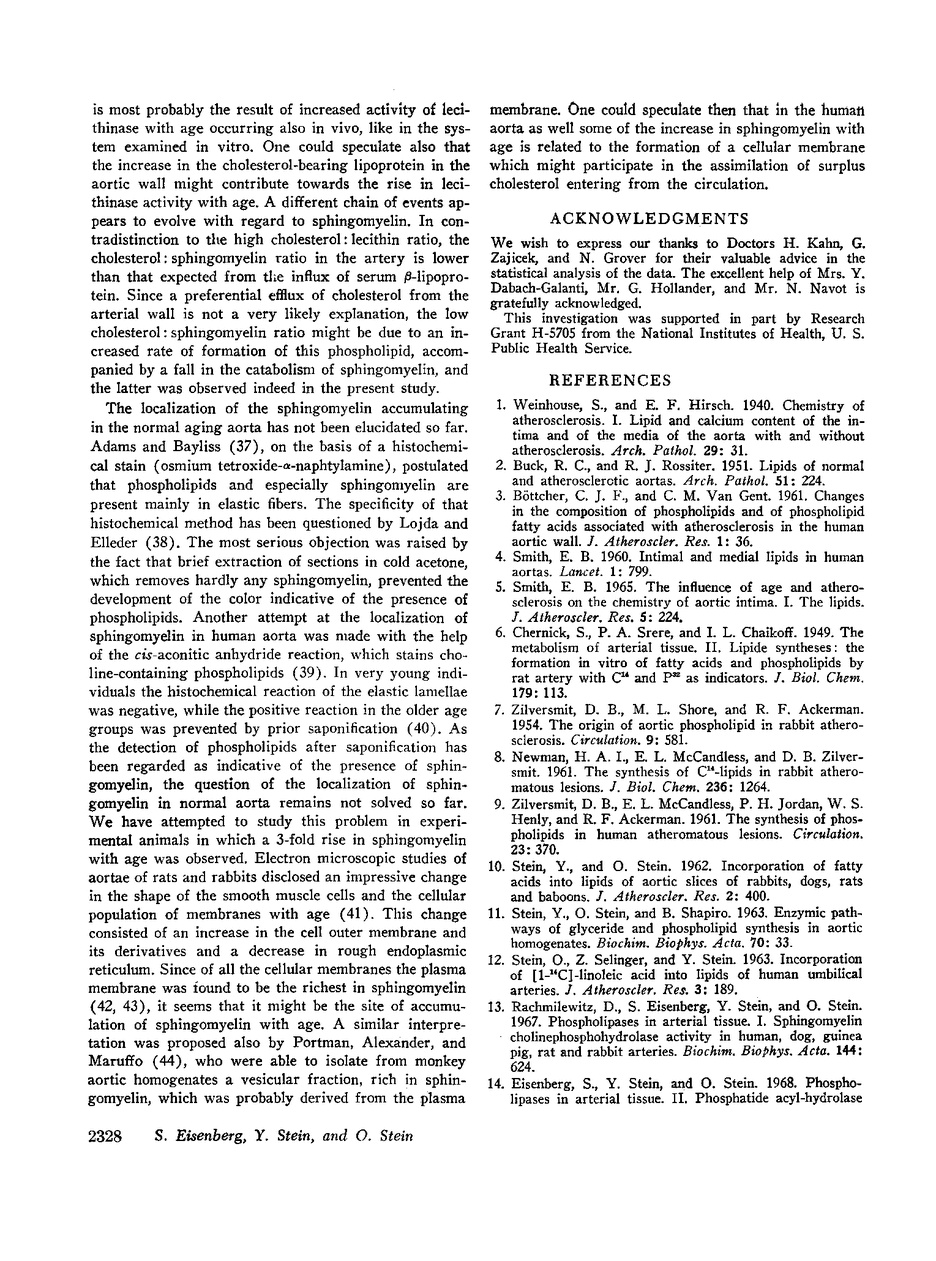 The role of phospholipases in the regulation of the changing phospholipid composition of normal human aortae with age was studied. Portions of grossly and histologically lesion-free ascending aortae from 16 females and 29 males obtained at autopsy, were analyzed for deoxyribonucleic acid (DNA), phospholipid, and cholesterol content and phospholipid composition. Enzymic activity toward four substrates, lecithin (LE), phosphatidyl ethanolamine, lysolecithin, and sphingomyelin (SP), was determined on portions of the same homogenate. By regression analysis for correlation between all determinations and age the following results were obtained: (a) total phospholipids and choleserol increased linearly with age; (b) the increase in sphingomyelin accounted for about 70% of the phospholipid increment; (c) hydrolysis of lecithin and phosphatidyl ethanolamine increased markedly with age, that of lysolecithin only moderately; (d) hydrolysis of sphingomyelin decreased with age; and (e) an inverse relation between the SP/LE ratio and age and sphingomyelinase/lecithinase activity and age was obtained. These results were interpreted to indicate that a causal relation exists between the fall in sphingomyelinase activity, both absolute and relative to lecithinase activity, and the accumulation of sphingomyelin with age.