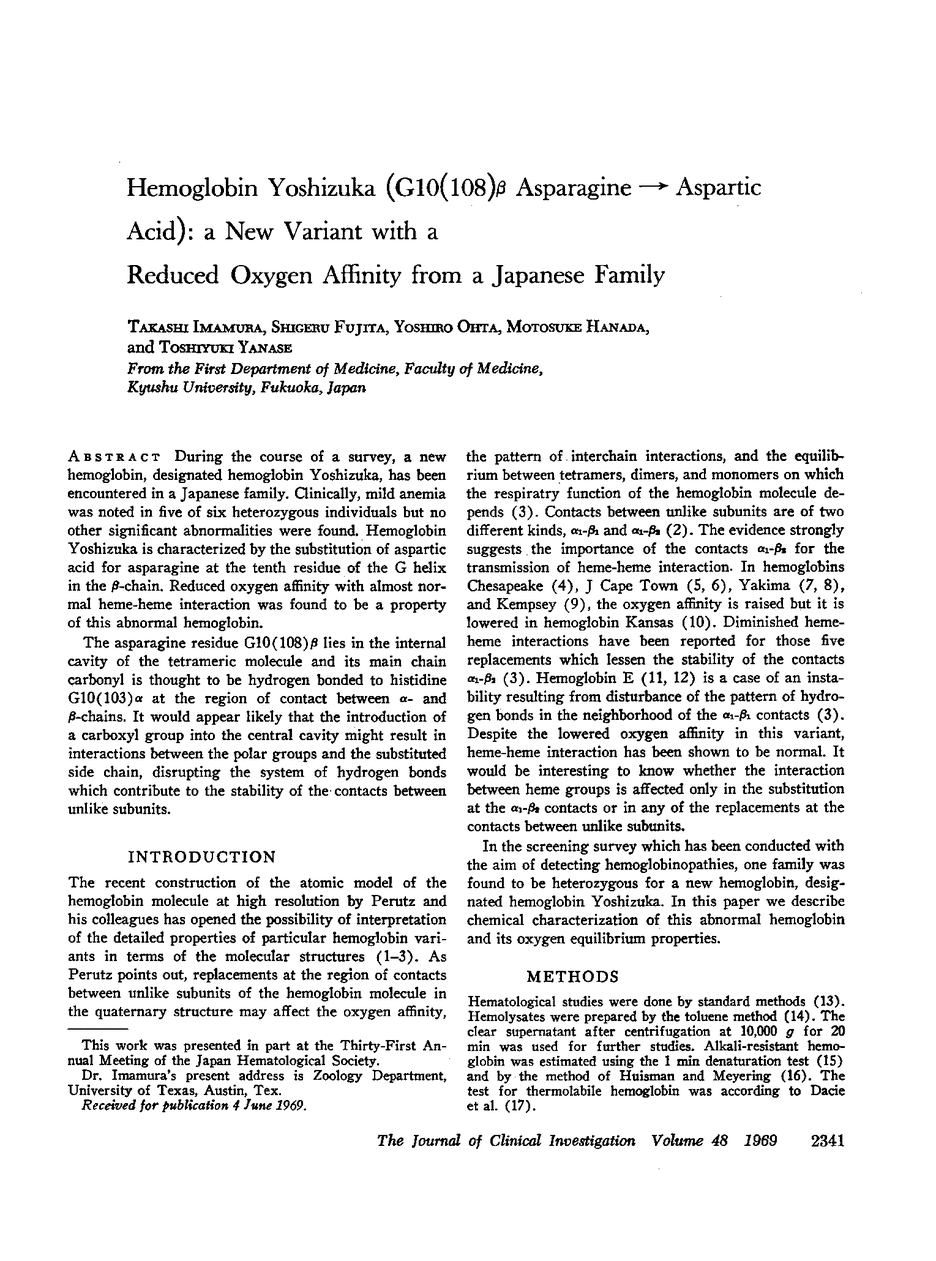 During the course of a survey, a new hemoglobin, designated hemoglobin Yoshizuka, has been encountered in a Japanese family. Clinically, mild anemia was noted in five of six heterozygous individuals but no other significant abnormalities were found. Hemoglobin Yoshizuka is characterized by the substitution of aspartic acid for asparagine at the tenth residue of the G helix in the β-chain. Reduced oxygen affinity with almost normal heme-heme interaction was found to be a property of this abnormal hemoglobin.