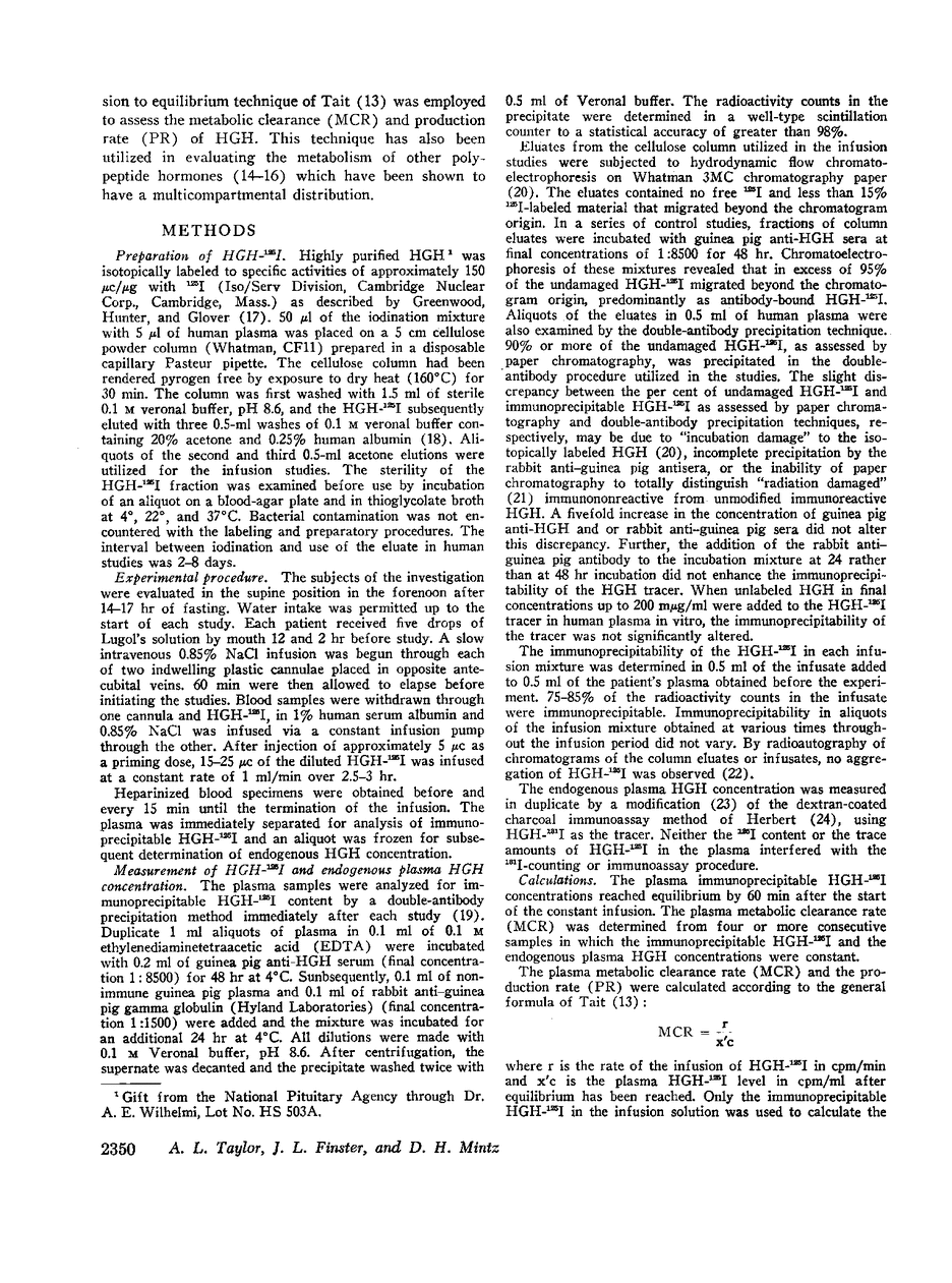 The metabolic clearance rate (MCR) of human growth hormone (HGH) was determined by the constant infusion to equilibrium technique utilizing HGH-125I. 22 control subjects had a MCR of 229 ±52 ml/min (mean ±SD). No difference was evident between sexes, or between various age groups. Patients with acromegaly demonstrated normal MCR's. Moreover, acute elevations of plasma growth hormone concentrations in normal subjects did not alter the MCR of HGH. The MCR was relatively constant from day to day and within the day when subjects were evaluated in the supine position. In contrast, the assumption of the upright position was associated with a mean 24% decrease in the MCR.