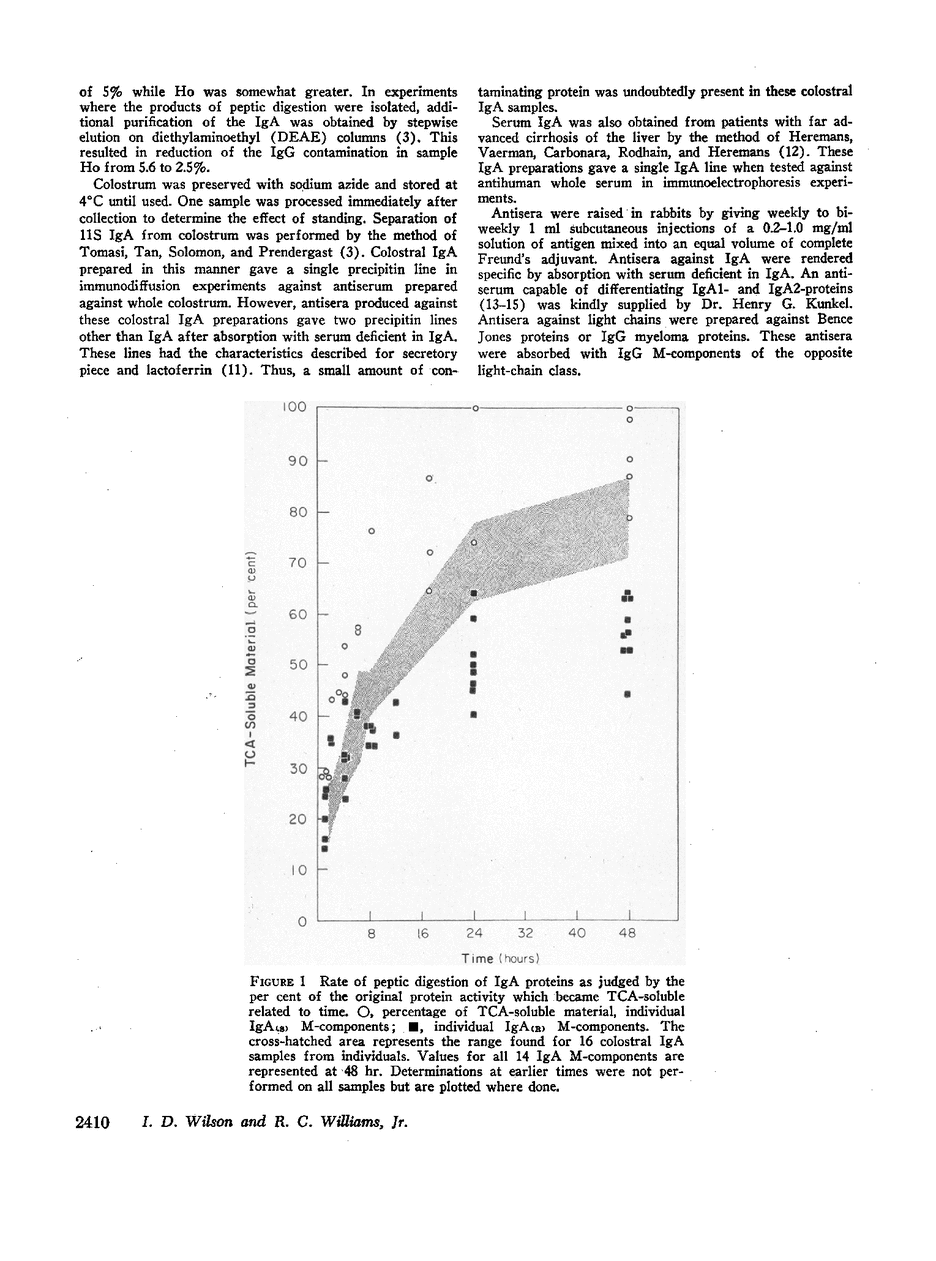 Serum IgA M-components, secretory IgA separated from colostrum, and IgA from serum of patients with cirrhosis of the liver were digested with pepsin at pH 4.1. The IgA M-components segregated into two groups on the basis of their relative rates of peptic digestion. Serum and colostral IgA were digested at a total rate intermediate to that of the two groups of IgA myeloma proteins. It appeared, however, that colostral IgA may have been initially more resistant to peptic digestion than serum IgA. The variability in the rate of peptic digestion was not related to electrophoretic mobility, light-chain type, or IgA subclass. Experimental conditions related to enzyme to substrate ratio or to the pH of the reaction mixture did not appear to explain the differences found.