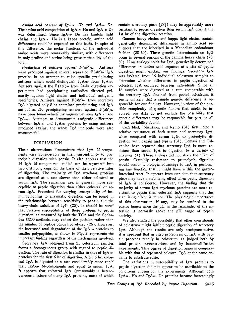 Serum IgA M-components, secretory IgA separated from colostrum, and IgA from serum of patients with cirrhosis of the liver were digested with pepsin at pH 4.1. The IgA M-components segregated into two groups on the basis of their relative rates of peptic digestion. Serum and colostral IgA were digested at a total rate intermediate to that of the two groups of IgA myeloma proteins. It appeared, however, that colostral IgA may have been initially more resistant to peptic digestion than serum IgA. The variability in the rate of peptic digestion was not related to electrophoretic mobility, light-chain type, or IgA subclass. Experimental conditions related to enzyme to substrate ratio or to the pH of the reaction mixture did not appear to explain the differences found.
