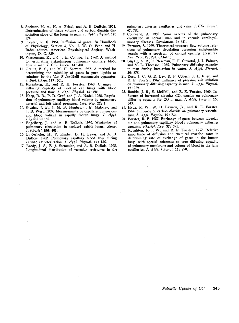 The instantaneous uptake of CO in the lungs was measured with a water-filled body plethysmograph in normal man. First, control measurements of plethysmograph pressure were made while the subject held his breath for 7 sec after breathing gas mixtures prepared to bring his alveolar PO2 and PCO2 close to mixed venous levels. Then, CO uptake measurements were made while he held his breath after inhaling the same gas mixtures with added CO (2.0%). The change in lung volume on CO minus the change in lung volume during the control measurement was a measure of the CO uptake in the lungs. Cardiopneumatic changes in lung gas volume were subtracted electrically. All of five subjects showed pulsatile CO uptake. The mean CO uptake was 103 ml/min. A peak uptake of 2.0 (range 1.6-2.3) times the mean uptake occurred 0.3-0.4 sec after the R wave of the EKG and a minimum uptake of 0.4 (range 0.2-0.5) times the mean uptake occurred during the tenth of a second before the R wave of the EKG. These results suggest that pulmonary capillary blood volume is pulsatile during the cardiac cycle.
