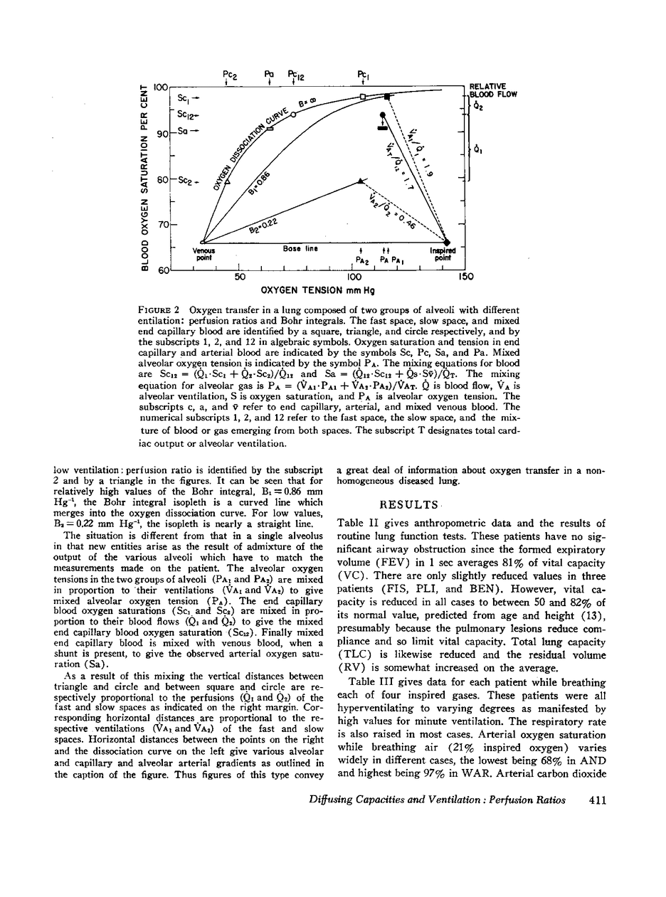 Studies were performed on 10 patients with the clinical syndrome of alveolar capillary block while each patient was breathing four different inspired oxygen mixtures. The data were interpreted using the principle of the Bohr integral isopleth with which alveolar oxygen tension in the differently ventilated parts of the lung can initially be treated as unknown. It is then possible to determine the distribution of ventilation, of perfusion, of diffusing capacity, of lung volume, and of alveolar and end capillary blood oxygen tension in the variously functioning parts of the lung. In two patients shunts were the major factor interfering with oxygen transfer. In four others inequalities in ventilation: perfusion ratios and in diffusing capacity in different parts of the lung were the factors interfering with oxygen transfer. In four more patients ventilation: perfusion ratios were the same throughout the lung, the only disturbance of oxygen transfer being in the total diffusing capacity or in its distribution between the different parts of the lung.