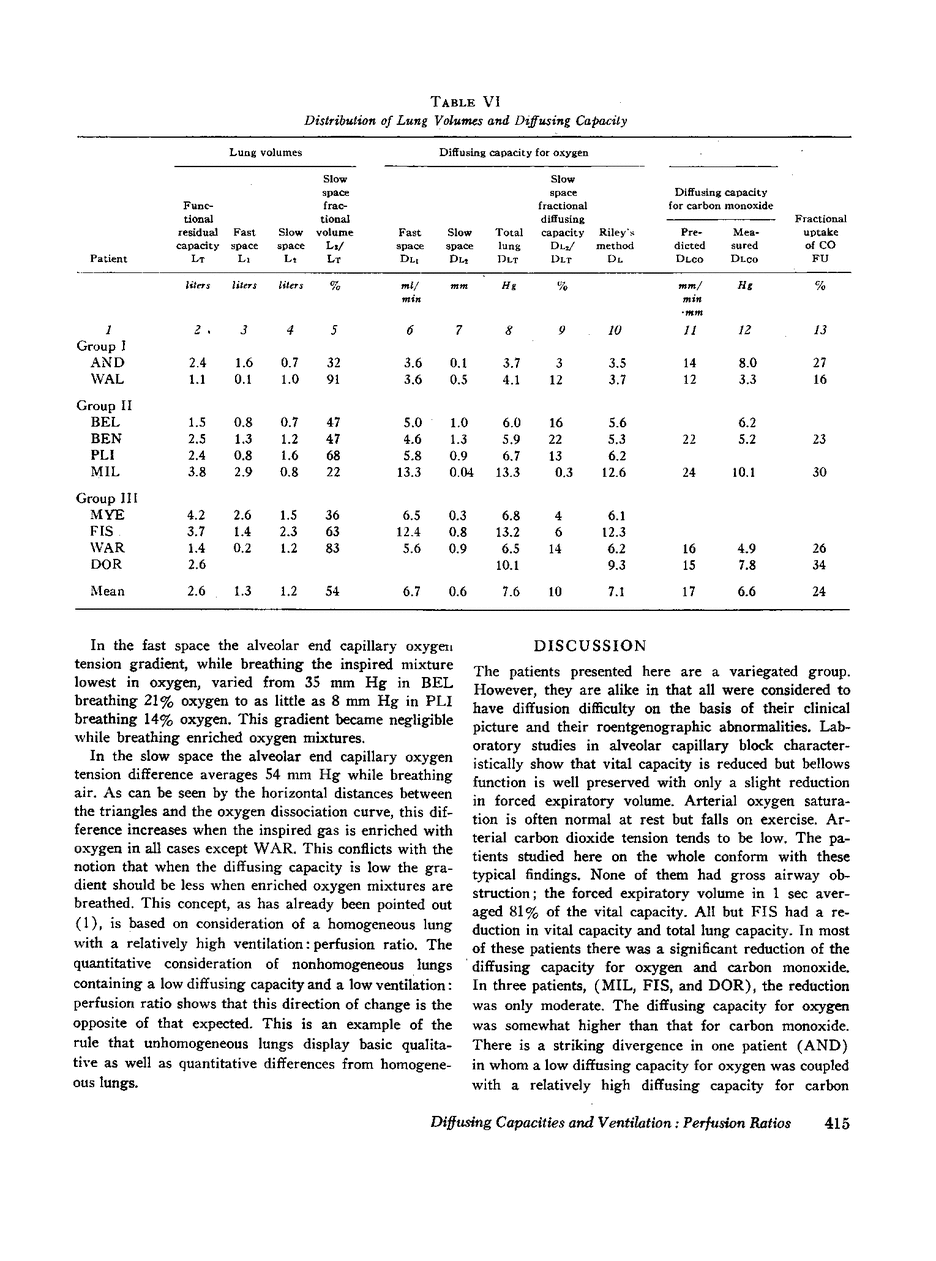 Studies were performed on 10 patients with the clinical syndrome of alveolar capillary block while each patient was breathing four different inspired oxygen mixtures. The data were interpreted using the principle of the Bohr integral isopleth with which alveolar oxygen tension in the differently ventilated parts of the lung can initially be treated as unknown. It is then possible to determine the distribution of ventilation, of perfusion, of diffusing capacity, of lung volume, and of alveolar and end capillary blood oxygen tension in the variously functioning parts of the lung. In two patients shunts were the major factor interfering with oxygen transfer. In four others inequalities in ventilation: perfusion ratios and in diffusing capacity in different parts of the lung were the factors interfering with oxygen transfer. In four more patients ventilation: perfusion ratios were the same throughout the lung, the only disturbance of oxygen transfer being in the total diffusing capacity or in its distribution between the different parts of the lung.