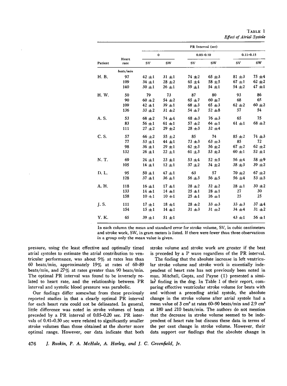In order to evaluate the effects of atrial contraction on left ventricular function, the pressure gradient technique was used to measure instantaneous aortic blood flow and pressure in nine patients, six having complete heart block and three having normal sinus rhythm. From these data both left ventricular stroke volume and stroke work were calculated. Ventricular rate was controlled by transvenous right ventricular pacing over a range of 50-158 beats/min. At each heart rate, beats which were not preceded by a P wave served as controls. The other beats were divided into six groups according to the duration of the preceding PR interval. The results indicated that stroke volume and stroke work were always affected similarly. In one patient the presence of a P wave did not alter the subsequent stroke volume significantly. In the other patients, beats preceded by P waves had stroke volumes greater than the controls. In general, there was no difference in stroke volume for beats preceded by a P wave having a PR interval within the range of 0.05-0.20 sec. As the PR interval lengthened beyond 0.20 sec stroke volume tended to decrease, especially at more rapid heart rates. The absolute increase in stroke volume after a beat preceded by a P wave (PR interval 0.05-0.20 sec) was quite variable among the patients. For a given patient the absolute increase in stroke volume was essentially independent of heart rate. The percentage change in stroke volume, however, was always greater as the heart rate increased.