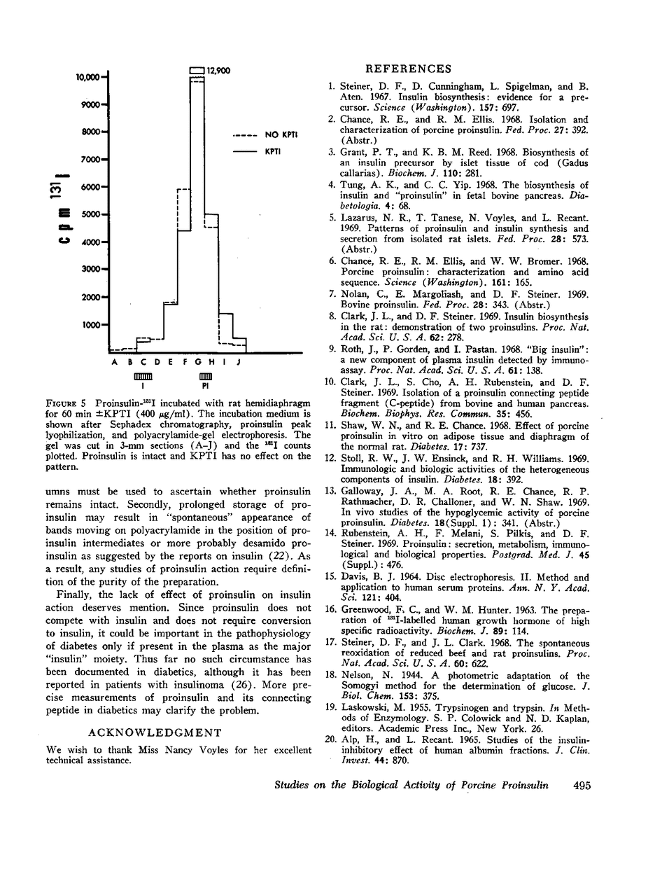 The biological activity of purified porcine proinsulin was investigated in rats. In vivo studies revealed that proinsulin produced a hypoglycemic response similar to insulin but of lesser magnitude. Hypophysectomized and adrenalectomized animals proved to be more sensitive to proinsulin than normal. In vitro studies with rat hemidiaphragm were consistent with the in vivo findings. No competition with insulin action could be demonstrated.