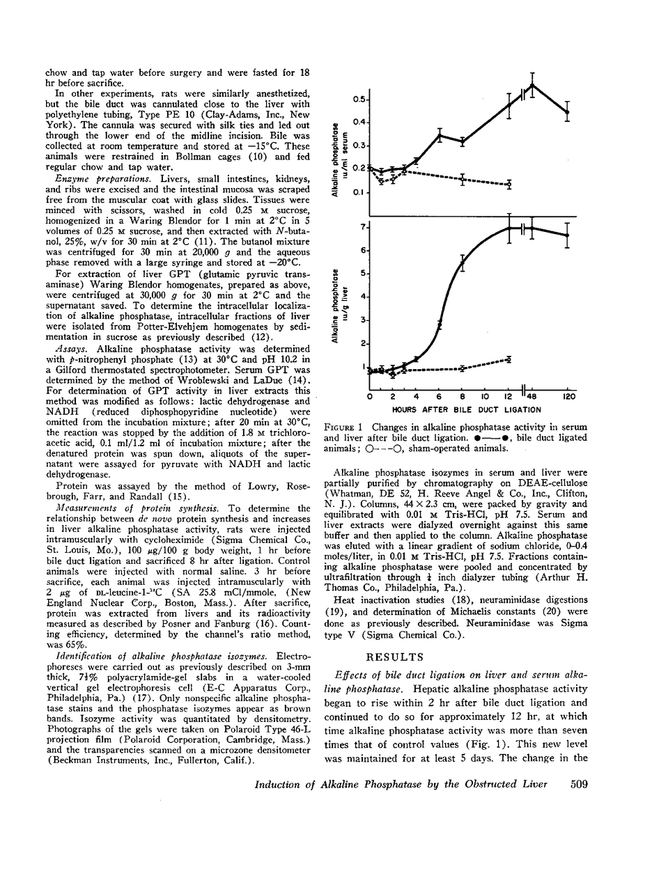 Bile duct ligation in the rat leads to a rapid increase in hepatic and serum alkaline phosphatase activity. Within 12 hr after bile duct ligation, hepatic alkaline phosphatase has increased 7-fold and serum alkaline phosphatase activity 2½-fold. The elevation in the serum activity is completely due to an increase in an isozyme that appears to originate in the liver. This serum isozyme and liver phosphatase, both partially purified by DEAE-cellulose column chromatography, have identical Michaelis constants, pH optima, and rates of heat denaturation. These isozymes migrate identically when subjected to electrophoresis on polyacrylamide gel, and their migration rates are equally slowed after neuraminidase digestion. The data suggest that the rise in hepatic alkaline phosphatase activity is dependent on de novo protein synthesis. Cycloheximide, in a dose that inhibited incorporation of leucine-14C into protein by 68%, inhibited the rise in liver phosphatase by 98% and that in serum by 80%. The rise in liver phosphatase activity could not be accounted for by simple retention of alkaline phosphatase that would normally appear in bile. The rise in liver activity after bile duct ligation was 240 times greater than the amount of phosphatase that normally appears in bile over a similar period of time. Cycloheximide had no effect on the bile duct ligation-induced changes in the serum and liver glutamic pyruvic transaminase.