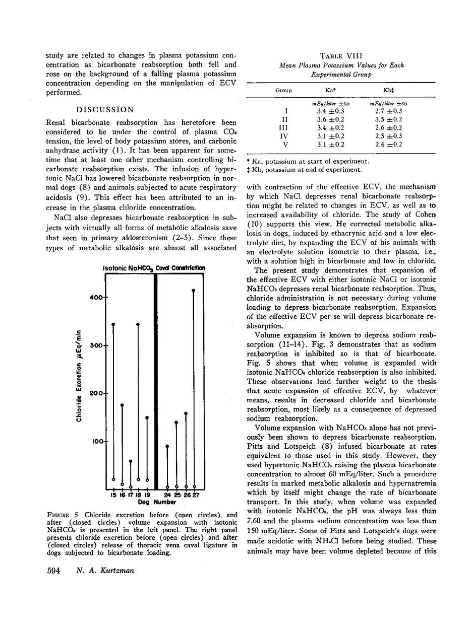 The ability of the kidney to reabsorb bicarbonate is held to be a function of plasma CO2 tension, carbonic anhydrase activity, and potassium stores. The effects of alterations of extracellular volume on bicarbonate reabsorption were studied in dogs whose arterial Pco2 was kept constant at 40 mm Hg (range 35-45 mm Hg).