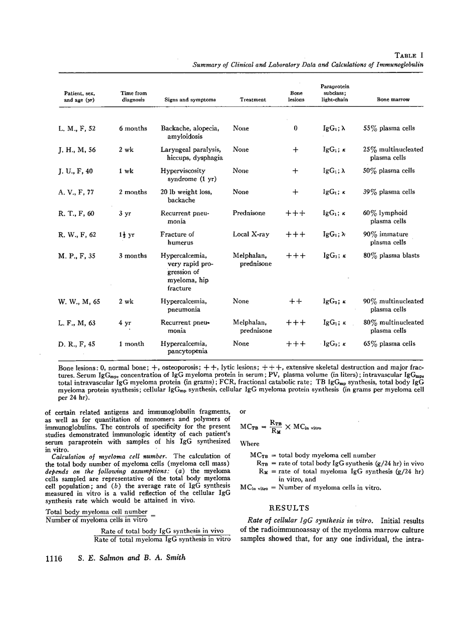 Studies of synthesis of IgG paraproteins were performed in 10 patients who had IgG myeloma in order to quantitate cellular immunosynthetic functions and derive estimates of the number of tumor cells present in such patients. Serial in vitro studies demonstrated constancy in the cellular rate of IgG paraprotein secretion for up to 8 months. Average molecular synthesis rates in different patients ranged from 12,500 to 85,000 molecules of IgG per minute per myeloma cell. Estimated total body tumor cell number ranged from 0.5 × 1012 to 3.1 × 1012 myeloma cells, and could be correlated with the degree of skeletal damage observed on roentgenograms (P = <0.01). Serial measurements of tumor cell number may prove useful in characterizing the growth rate and natural history of multiple myeloma. Myeloma is the first metastatic human malignancy in which quantitative measurements of the body's burden of malignant cells have been obtained.