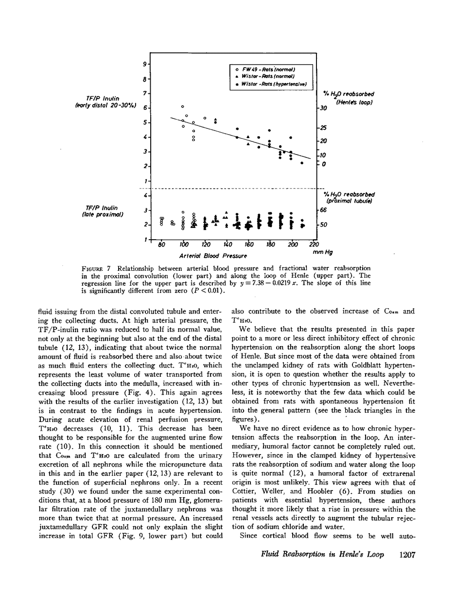 The function of the short loops of Henle was investigated by micropuncture technique in normal rats, in rats with spontaneous hypertension, and in the untouched kidney of rats with experimental renal hypertension. All animals received a standard infusion of 1.2 ml of isotonic saline per hr.