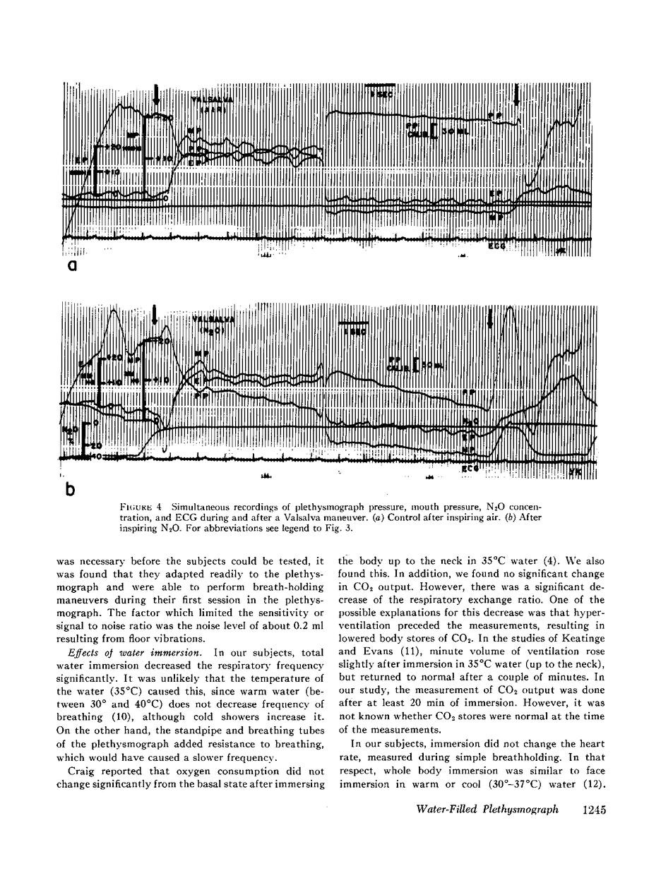 A water-filled body plethysmograph was constructed to measure gas exchange in man. As compared to an air-filled plethysmograph, its advantages were greater sensitivity, less thermal drift, and no change from adiabatic to isothermal conditions after a stepwise change of pressure. When five subjects were completely immersed within it and were breathing to the ambient atmosphere, they had a normal heart rate, oxygen consumption, CO2 output, and functional residual capacity. Pulmonary capillary blood flow ([unk]Qc) during and after Valsalva and Mueller maneuvers was calculated from measurements of N2O uptake. Control measurements of [unk]Qc were 2.58 liters/min per m2 at rest and 3.63 liters/min per m2 after moderate exercise. During the Valsalva maneuver at rest (intrapulmonary pressure: 24, SD 3.0, mm Hg), [unk]Qc decreased from a control of 2.58, SD 0.43, liters/min per m2 to 1.62, SD 0.26, liters/min per m2 with a decrease in pulmonary capillary stroke volume from a control of 42.4, SD 8.8, ml/stroke per m2 to 25.2, SD 5.5, ml/stroke per m2. After release of the Valsalva, there was an overshoot in [unk]Qc averaging +0.78, SD 0.41, liter/min per m2 accompanied by a significant increase in heart rate. Similar changes occurred during and after the Valsalva following moderate exercise. During the Mueller maneuver at rest and after exercise, [unk]Qc, heart rate, and central stroke volume did not change significantly.