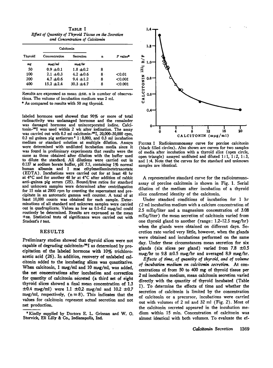The secretion of calcitonin by slices of porcine thyroid glands has been investigated. Calcitonin in the incubation medium was determined by radioimmunoassay. Secretion of calcitonin was diminished when calcium or magnesium was omitted and was increased stepwise as the concentration of calcium or magnesium in the incubation medium was increased. Calcitonin secretion was augmented substantially when either the quantity of thyroid tissue or volume of incubation medium was increased. Secretion of calcitonin was stimulated by glucagon, theophylline, and dibutyryl cyclic 3′,5′-adenosine monophosphate. It is concluded that calcitonin secretion is regulated by the concentration of calcium and magnesium, that secretion may be inhibited by calcitonin or a precursor and that secretion can be stimulated by increasing the concentration of cyclic 3′,5′-adenosine monophosphate in the parafollicular cells of the thyroid gland.