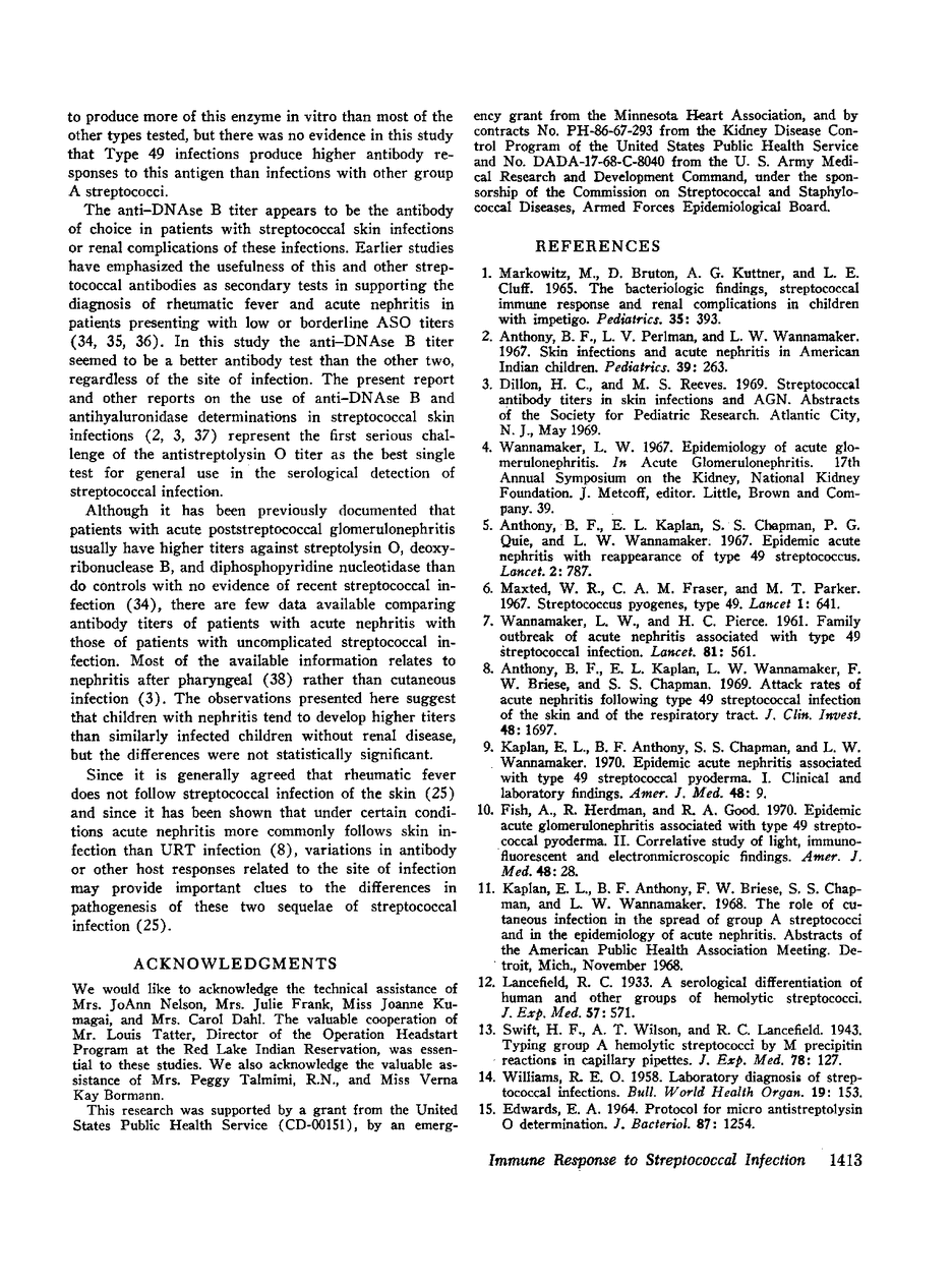 The immune response after streptococcal infection of the skin and of the upper respiratory tract (URT) was studied prospectively in a group of normal children, ages 3-6 yr. The children were examined and cultures for group A streptococci were obtained weekly from the throat, nose, and skin lesions (when present). Paired sera were collected at the beginning and end of the study, and the changes in antibody titers were measured for three different streptococcal antigens: streptolysin O, deoxyribonuclease B (DNAse B), and nicotinamide adenine dinucleotidase (NADase).