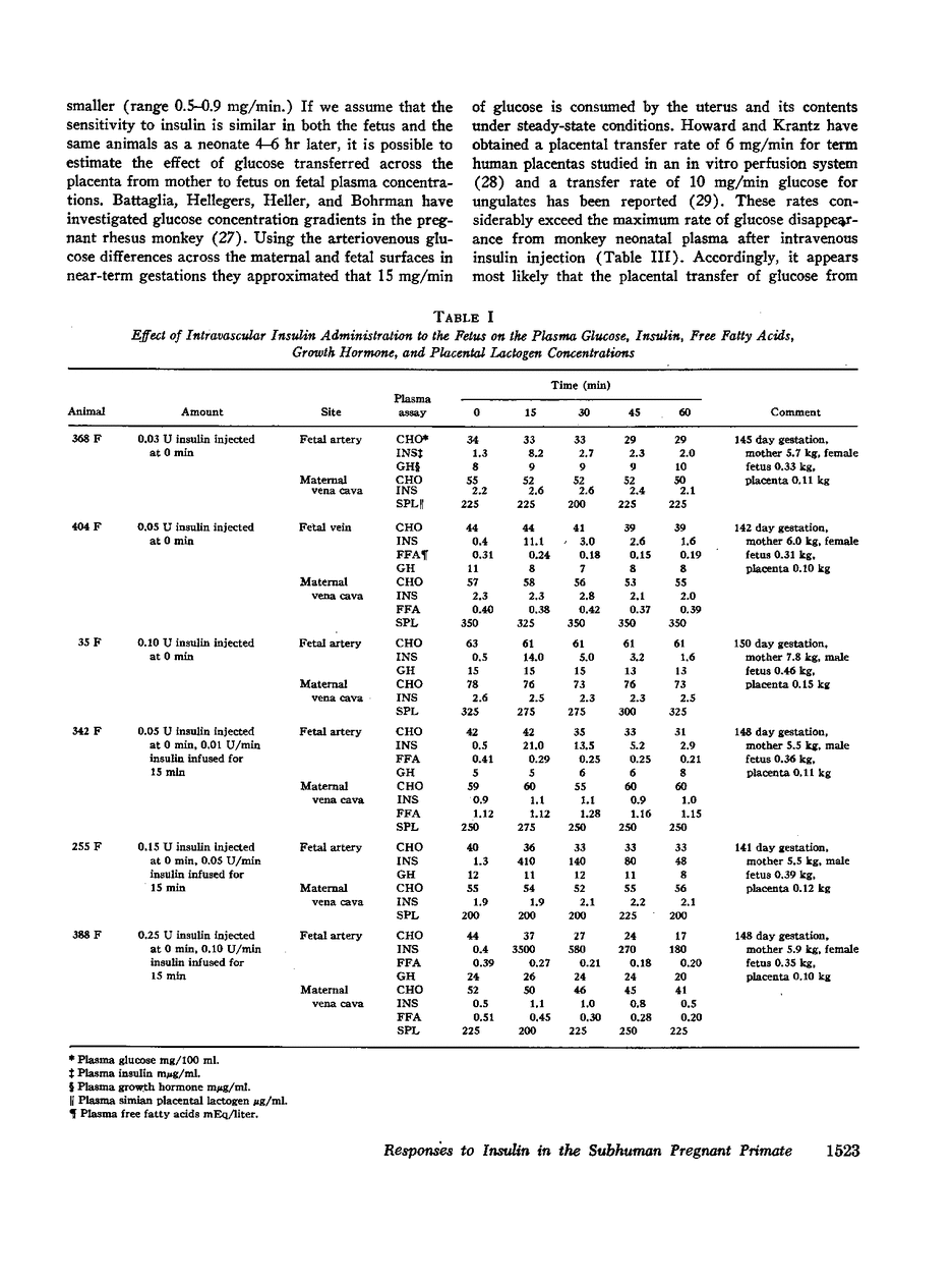 The concentrations of plasma glucose, free fatty acids, insulin, growth hormone, and placental prolactin in subhuman primate fetal and maternal plasma were examined following intravascular administration of insulin and glucagon to the fetus and mother. The neonatal plasma responses to these same stimuli were also examined.