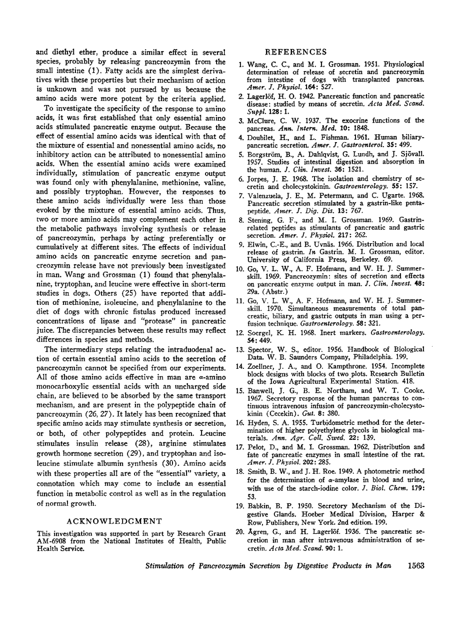 The ability of products of digestion to stimulate pancreozymin secretion in man was investigated using a bioassay procedure, based on duodenal perfusion, which quantified the total outputs of pancreatic enzymes evoked by intraduodenal stimuli under steady-state conditions. Patterns of response resulting from physiologic intraduodenal concentrations of test material were basal output (with isotonic saline), washout of enzymes (with dextrose, micellar fatty acid, and amino acids), and sustained output of enzymes (with amino acids and micellar fatty acid). The sustained secretion of pancreatic enzymes found during the 2nd hr of perfusion and subsequently was characteristic of pancreozymin-induced secretion. The enzyme output in response to a mixture of essential and nonessential amino acids was significantly higher than that evoked by micellar fatty acid and was comparable with that resulting from the maximally tolerated dose of pancreozymin given by vein.