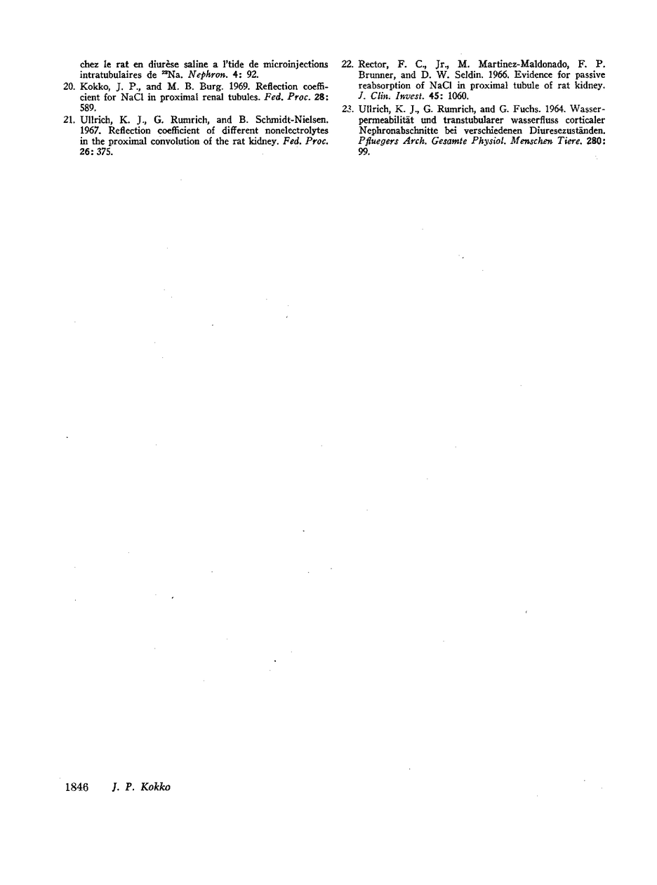 The unique membrane characteristics of the thin descending limb of Henle (DLH) play an integral part in the operation of the countercurrent system. We examined these properties in vitro by perfusing isolated thin descending limbs of rabbits. Active transport of NaCl was ruled out by failure to demonstrate either net transport or transmembrane potential difference when perfusing with isosmolal ultrafiltrate of the same rabbit serum as the bath. Transmembrane potential was zero, and net fluid transport was -0.07 ±0.06 nl mm-1 min-1, which also is not significantly different from zero. Passive permeability coefficient for Na(PNa) was determined from the disappearance rate of 22Na from isosmolal perfusion solution. PNa was surprisingly low, 1.61 ±0.27 × 10-5 cm sec-1, a figure which is significantly less than PNa in the proximal convoluted tubule (PCT). Reflection coefficient for NaCl (σNaCl) was measured by perfusing the tubule with Na-free raffinose solution in a bath of rabbit serum to which sufficient NaCl was added to obtain conditions of zero net fluid movement. The measured σNaCl of 0.96 ±0.01 is significantly greater than σNaCl in the PCT. Water permeability to osmotic gradients (Lp) was determined by perfusing with ultrafiltrate of rabbit serum in a bath made hyperosmotic by addition of either 100 mOsm raffinose or NaCl. Lp with raffinose was 1.71 ±0.15 × 10-4 ml cm-2 sec-1 atm-1 and with NaCl 1.62 ±0.05 × 10-4 ml cm-2 sec-1 atm-1, indicating much greater water permeability than in the PCT. In each case the measured increase in osmolality of the collected fluid was primarily due to water efflux without significant influx of solute.