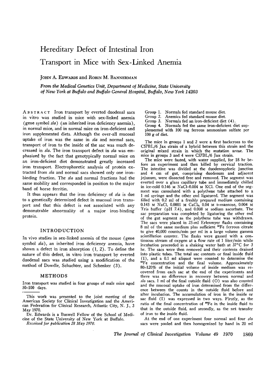 Iron transport by everted duodenal sacs in vitro was studied in mice with sex-linked anemia (gene symbol sla) (an inherited iron deficiency anemia), in normal mice, and in normal mice on iron-deficient and iron supplemented diets. Although the over-all mucosal uptake of iron was the same in sla and normal sacs, transport of iron to the inside of the sac was much decreased in sla. The iron transport defect in sla was emphasized by the fact that genotypically normal mice on an iron-deficient diet demonstrated greatly increased iron transport. Electrophoretic analysis of protein extracted from sla and normal sacs showed only one iron-binding fraction. The sla and normal fractions had the same mobility and corresponded in position to the major band of horse ferritin.