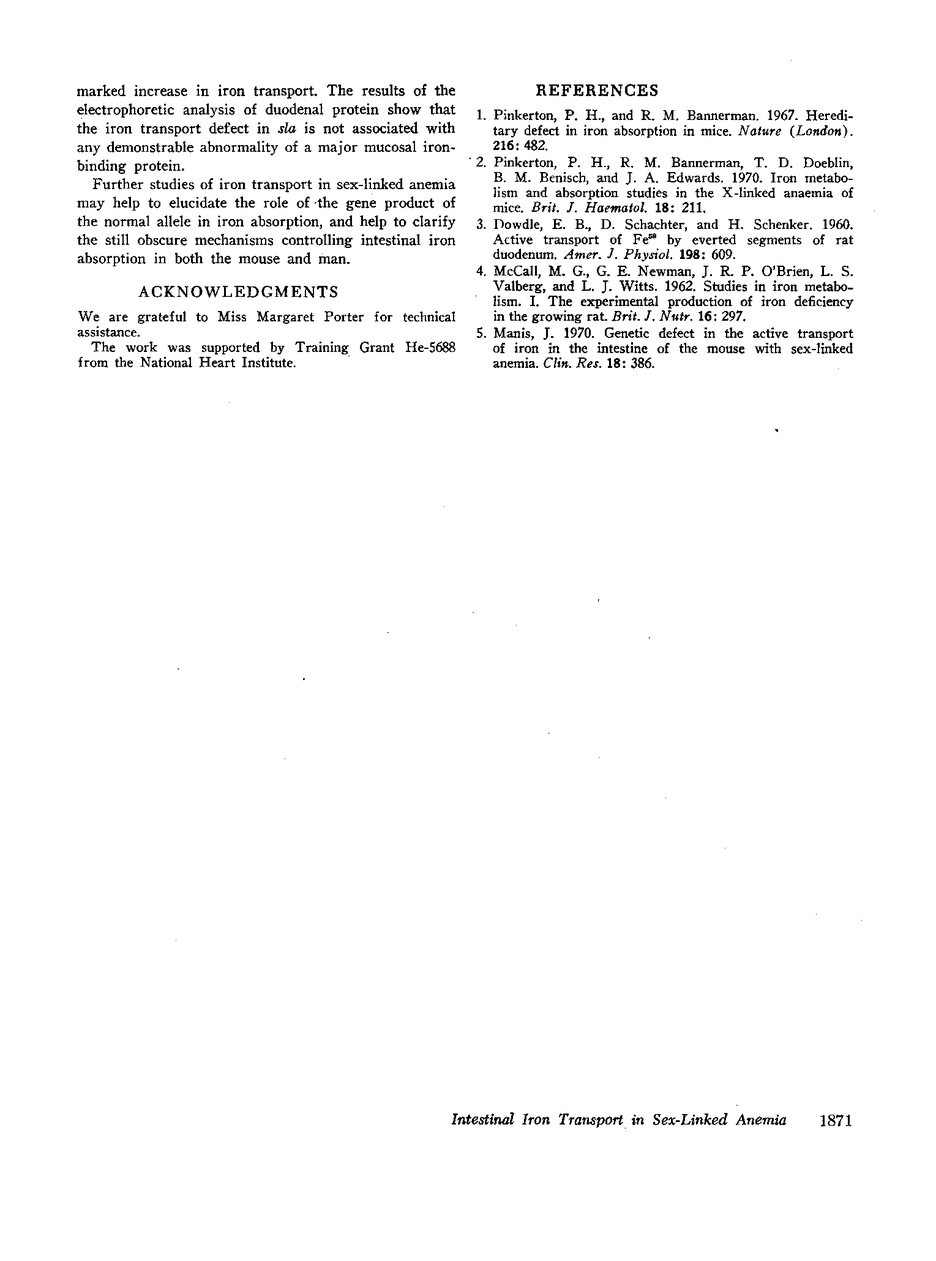 Iron transport by everted duodenal sacs in vitro was studied in mice with sex-linked anemia (gene symbol sla) (an inherited iron deficiency anemia), in normal mice, and in normal mice on iron-deficient and iron supplemented diets. Although the over-all mucosal uptake of iron was the same in sla and normal sacs, transport of iron to the inside of the sac was much decreased in sla. The iron transport defect in sla was emphasized by the fact that genotypically normal mice on an iron-deficient diet demonstrated greatly increased iron transport. Electrophoretic analysis of protein extracted from sla and normal sacs showed only one iron-binding fraction. The sla and normal fractions had the same mobility and corresponded in position to the major band of horse ferritin.