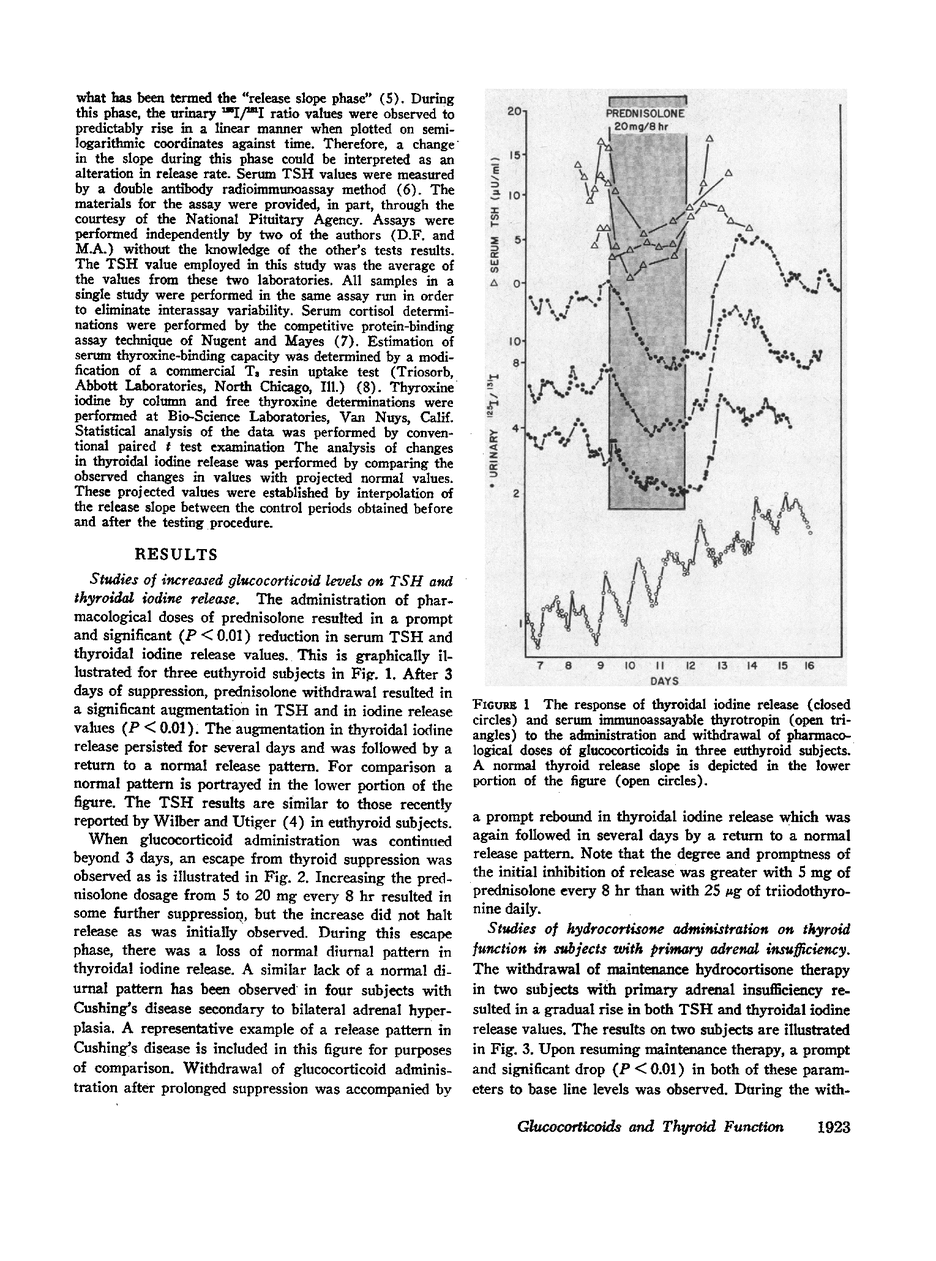 The diurnal variation in thyroidal iodine release previously observed in euthyroid subjects appears to correlate with variations in serum immunoassayable thyrotropin (TSH). The hypothesis is advanced that this diurnal rhythm seems to be primarily regulated by a negative feedback action of circulating hydrocortisone. The administration of maintenance doses of hydrocortisone to patients with primary adrenal insufficiency and pharmacological doses to euthyroid subjects was accompanied by an acute suppression in both thyroidal iodine release and serum TSH values. An escape from glucocorticoid suppression was observed to occur in 2 or 3 days with the resumption of a near-normal thyroidal iodine release rate but was accompanied by a dampening or absence of the normal diurnal rhythm. Withdrawal of pharmacological doses of glucocorticoids in euthyroid subjects and maintenance doses in primary hypoadrenal patients was accompanied by transient stimulation of both serum TSH and thyroidal iodine release values. The study of a patient before and after cryohypophysectomy indicated that the rebound response in thyroid release after steroid withdrawal may be a useful testing procedure to indirectly assess the hypothalamicpituitary reserve capacity of TSH.
