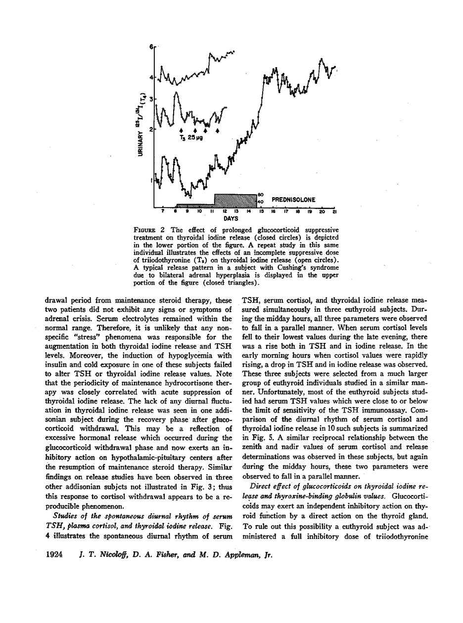 The diurnal variation in thyroidal iodine release previously observed in euthyroid subjects appears to correlate with variations in serum immunoassayable thyrotropin (TSH). The hypothesis is advanced that this diurnal rhythm seems to be primarily regulated by a negative feedback action of circulating hydrocortisone. The administration of maintenance doses of hydrocortisone to patients with primary adrenal insufficiency and pharmacological doses to euthyroid subjects was accompanied by an acute suppression in both thyroidal iodine release and serum TSH values. An escape from glucocorticoid suppression was observed to occur in 2 or 3 days with the resumption of a near-normal thyroidal iodine release rate but was accompanied by a dampening or absence of the normal diurnal rhythm. Withdrawal of pharmacological doses of glucocorticoids in euthyroid subjects and maintenance doses in primary hypoadrenal patients was accompanied by transient stimulation of both serum TSH and thyroidal iodine release values. The study of a patient before and after cryohypophysectomy indicated that the rebound response in thyroid release after steroid withdrawal may be a useful testing procedure to indirectly assess the hypothalamicpituitary reserve capacity of TSH.