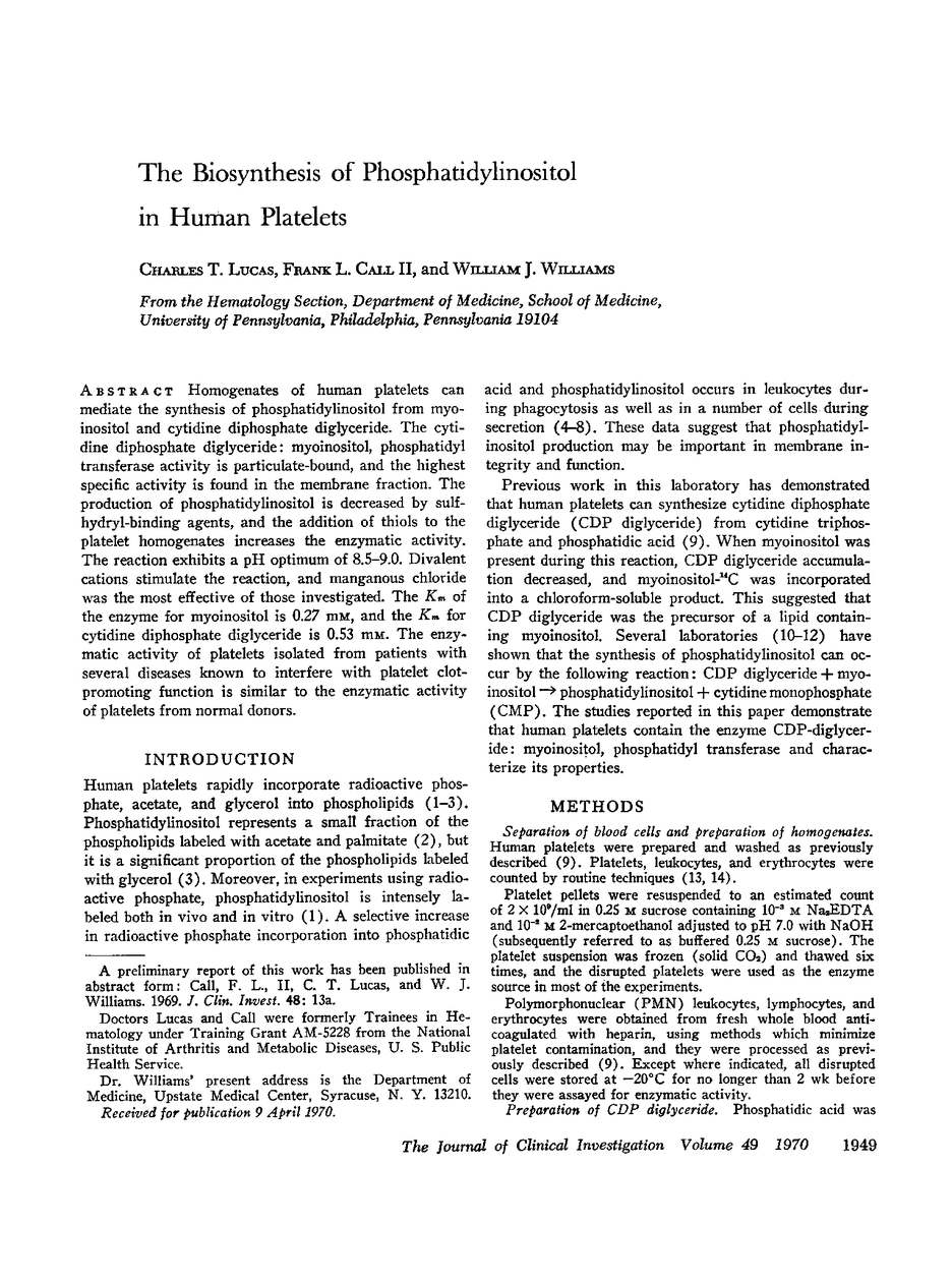 Homogenates of human platelets can mediate the synthesis of phosphatidylinositol from myoinositol and cytidine diphosphate diglyceride. The cytidine diphosphate diglyceride: myoinositol, phosphatidyl transferase activity is particulate-bound, and the highest specific activity is found in the membrane fraction. The production of phosphatidylinositol is decreased by sulfhydryl-binding agents, and the addition of thiols to the platelet homogenates increases the enzymatic activity. The reaction exhibits a pH optimum of 8.5-9.0. Divalent cations stimulate the reaction, and manganous chloride was the most effective of those investigated. The Km of the enzyme for myoinositol is 0.27 mM, and the Km for cytidine diphosphate diglyceride is 0.53 mM. The enzymatic activity of platelets isolated from patients with several diseases known to interfere with platelet clotpromoting function is similar to the enzymatic activity of platelets from normal donors.