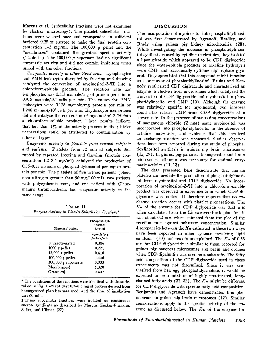 Homogenates of human platelets can mediate the synthesis of phosphatidylinositol from myoinositol and cytidine diphosphate diglyceride. The cytidine diphosphate diglyceride: myoinositol, phosphatidyl transferase activity is particulate-bound, and the highest specific activity is found in the membrane fraction. The production of phosphatidylinositol is decreased by sulfhydryl-binding agents, and the addition of thiols to the platelet homogenates increases the enzymatic activity. The reaction exhibits a pH optimum of 8.5-9.0. Divalent cations stimulate the reaction, and manganous chloride was the most effective of those investigated. The Km of the enzyme for myoinositol is 0.27 mM, and the Km for cytidine diphosphate diglyceride is 0.53 mM. The enzymatic activity of platelets isolated from patients with several diseases known to interfere with platelet clotpromoting function is similar to the enzymatic activity of platelets from normal donors.