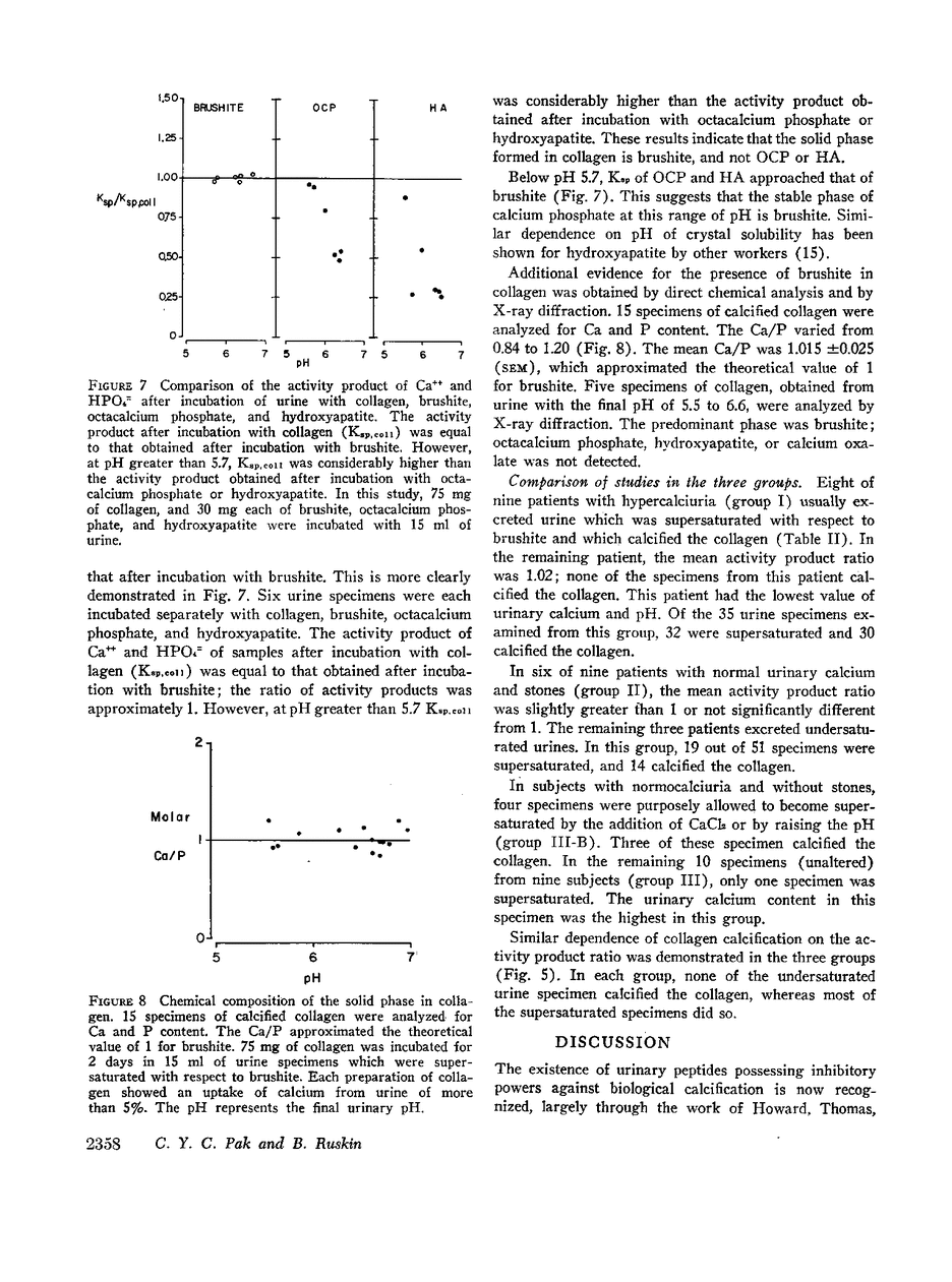A state of supersaturation of urine with respect to brushite is considered to be important in the formation of renal stones composed of calcium phosphate. 56 supersaturated urine specimens and 44 undersaturated specimens were incubated with collagen (Sigma collagen). Most of the supersaturated specimens calcified the collagen, whereas none of the undersaturated ones did so. Among samples which calcified the collagen, whereas none of the undersaturated ones did so. Among samples which calcified the collagen, the activity product of Ca++ and HPO4= after incubation with collagen was essentially the same as that after incubation of the same specimen with brushite; it usually differed from that obtained after incubation with octacalcium phosphate or hydroxyapatite. The molar calcium-to-phosphorus ratio of the solid phase in collagen was approximately 1. These results suggested that the solid phase formed in collagen is brushite. This conclusion was confirmed by the direct identification of brushite in collagen by X-ray diffraction.