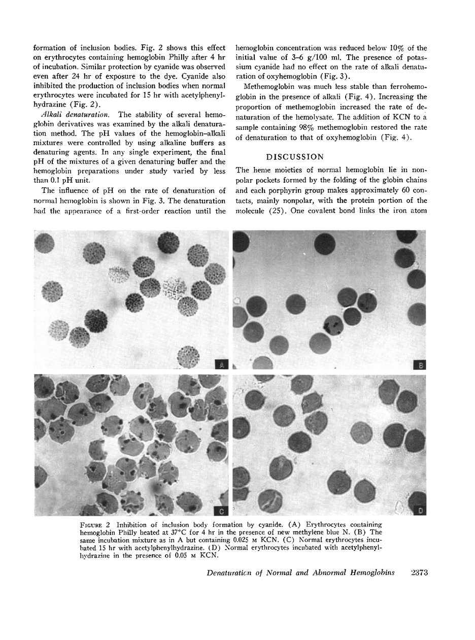 Several unstable mutant hemoglobins have alterations which affect areas of the molecule involved in the attachment of heme to globin. Loss of heme from globin has been demonstrated during the denaturation of some of these unstable mutants. The importance of heme ligands for the stability of hemoglobin was illustrated in the present experiments on the denaturation of several hemoglobins and hemoglobin derivatives by heat, oxidative dyes, and alkali. Heating of normal hemolysates diluted to 4 g of hemoglobin per 100 ml at 50°C for 20 hr in 0.05 M sodium phosphate, pH 7.4, caused precipitation of 23-54% of the hemoglobin. Dialysis against water or dilution of the sample decreased denaturation to 12-20%. Precipitation was decreased to less than 3.5% by the presence of 0.015 M potassium cyanide. Increasing the ionic strength of the medium increased precipitation. Cyanide prevented the formation of inclusion bodies when red cells containing unstable hemoglobin Philly, β35 tyr → phe, were incubated with the redox dye new methylene blue. Conversion to methemoglobin increased the rate of alkali denaturation of hemoglobin but the presence of potassium cyanide returned the denaturation rate to that of ferrohemoglobin. The ability of cyanide to decrease heat precipitation of hemoglobin may depend on a dimeric or tetrameric state of the hemoglobin molecule. Purified β-chains, which exist as tetramers, were stabilized but purified monomeric α-chains were not rendered more heat resistant by the ligand. Stabilization of hemoglobin by cyanide required binding of the ligand to only one heme of an αβ-dimer. Hemoglobin Gun Hill, an unstable molecule with heme groups present only on the α-chains was quite heat stable in the presence of cyanide. The binding of cyanide to the iron atom in methemoglobin is thought to be associated with increased planarity of the heme group and increased stability of the heme-globin complex. The stabilizing effect of cyanide in the above experiments suggests that Heinz body formation, heat precipitation of hemoglobin, and the increased alkali denaturation of methemoglobin depend on changes of heme-globin binding.