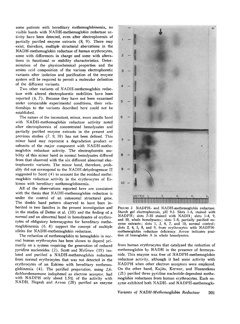 The electrophoretic mobility and activity of NADH-methemoglobin reductase in erythrocytes of patients with hereditary methemoglobinemia, obligatory heterozygotes, and normal subjects were examined. Six distinct electrophoretic variants were found in studies of erythrocytes from members of ten different families. Five variants (Boston Slow, Duarte, Princeton, Puerto Rico, and California) were associated with significant methemoglobinemia and moderate to marked decreases in enzymic activity. Precise correlations between levels of NADH-methemoglobin reductase activity, electrophoretic mobility, and clinical severity of methemoglobinemia, however, could not be drawn. One variant (Boston Fast) was associated with almost normal activity and very minimal methemoglobinemia. Nine members from three generations of two Italian families were found to have two bands with NADH-methemoglobin reductase activity in their erythrocytes, one with normal mobility and one with a mobility identical with that of Boston Fast. No functional or clinical impairment could be attributed to this abnormality. The observations made in this investigation were consistent with an autosomal recessive mode of inheritance of multiple alleles for NADH-methemoglobin reductase. As has been shown to be true for hemoglobin and glucose-6-phosphate dehydrogenase, multiple aberrations in the NADH-methemoglobin reductase of human erythrocytes apparently exist, some with and some without functional consequences.